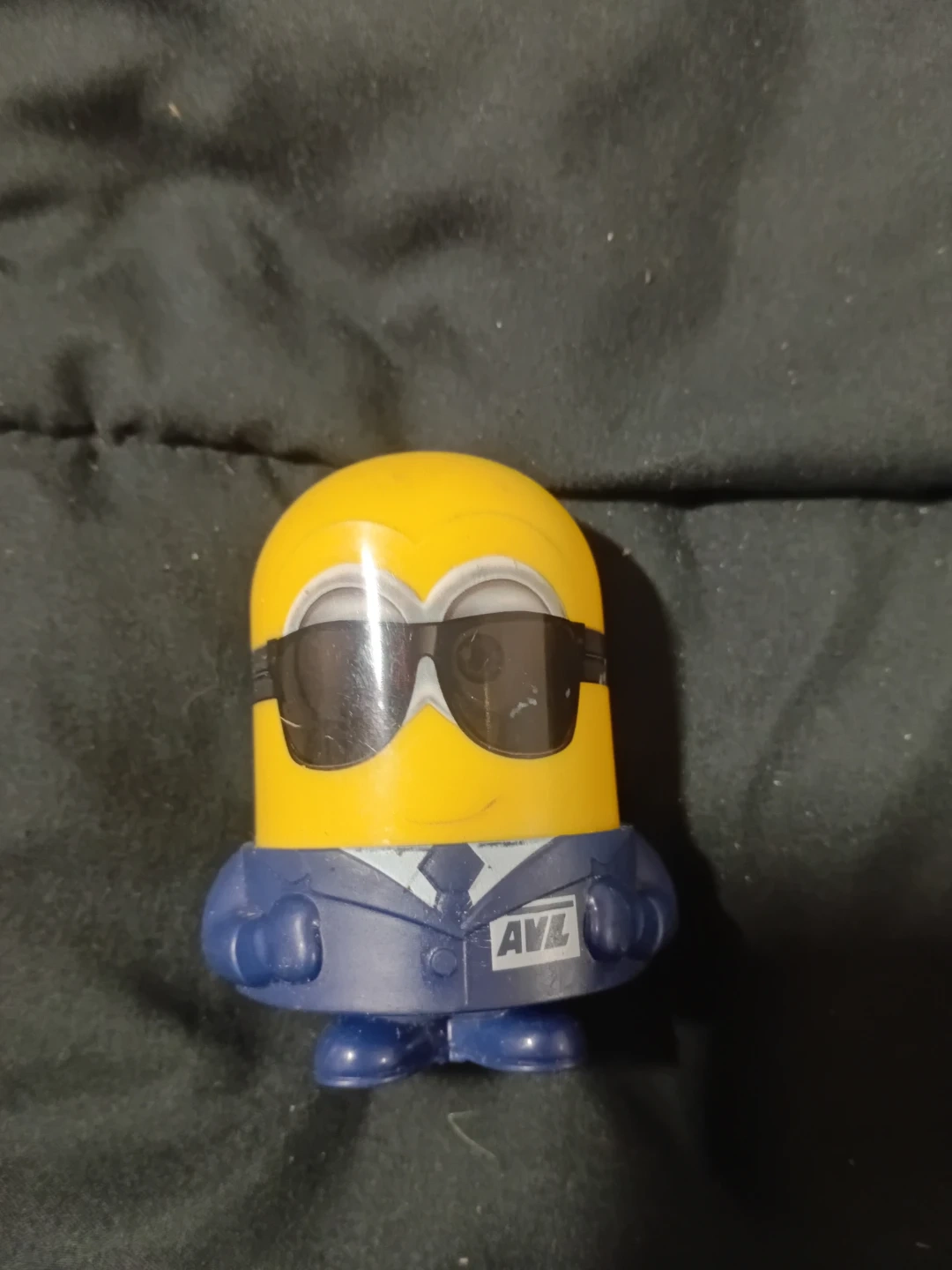 This is a yellow Minion toy figure wearing sunglasses and a blue suit with an 'AVL' logo. It's made of plastic. This collectible figure would be fun for any fan of the Minions movies. It's a small toy for display.