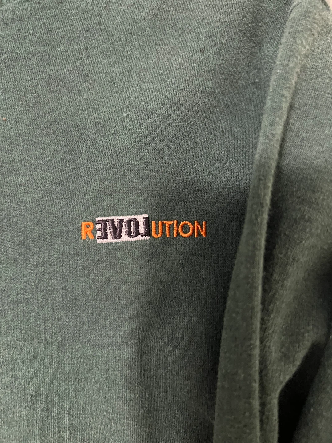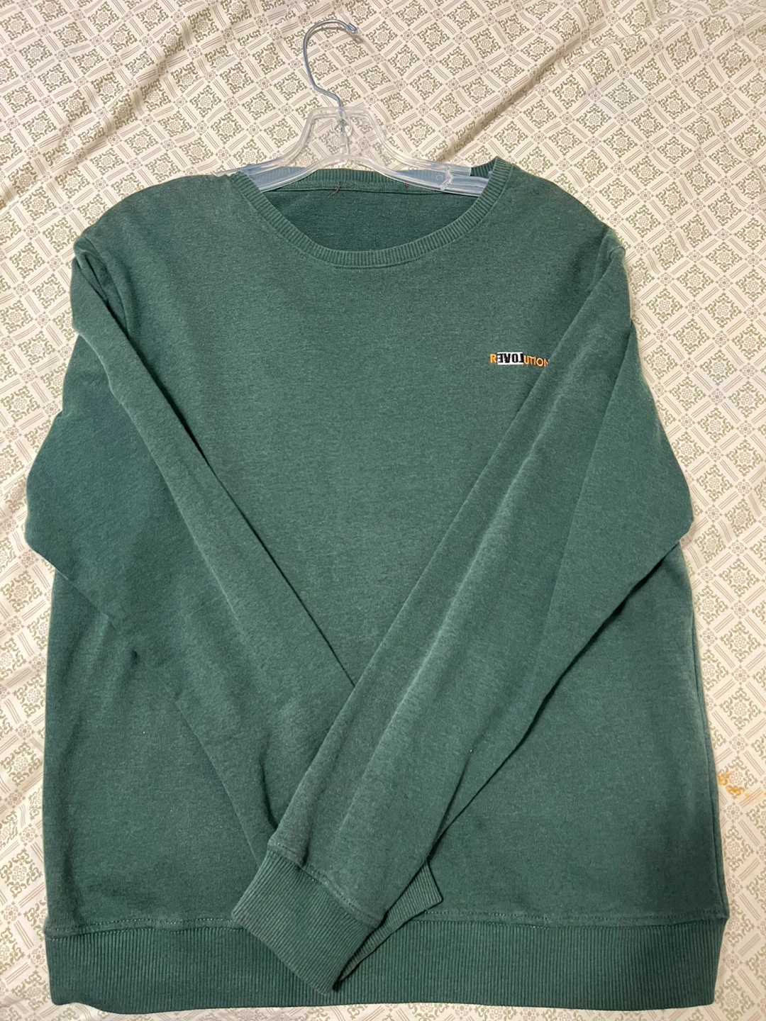 Green crewneck sweatshirt with 'Revolution' embroidered on the chest. It's a comfortable staple for casual wear. Cotton blend material.
