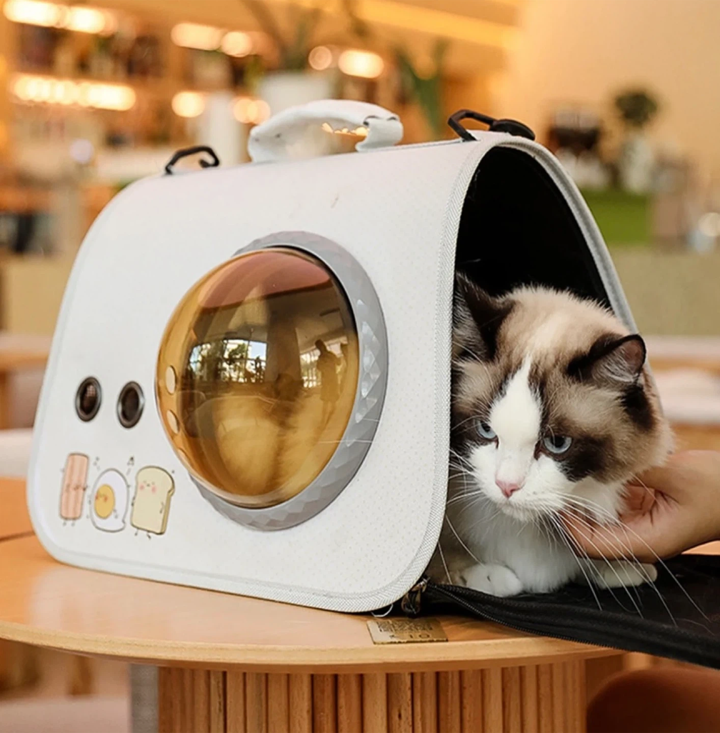 This cute pet carrier bag features a fun breakfast-themed design. It comes with a built-in fan for ventilation and a clear bubble window so your pet can see out. The carrier also includes a detachable shoulder strap for easy transport. It's great for taking your small pet on the go!