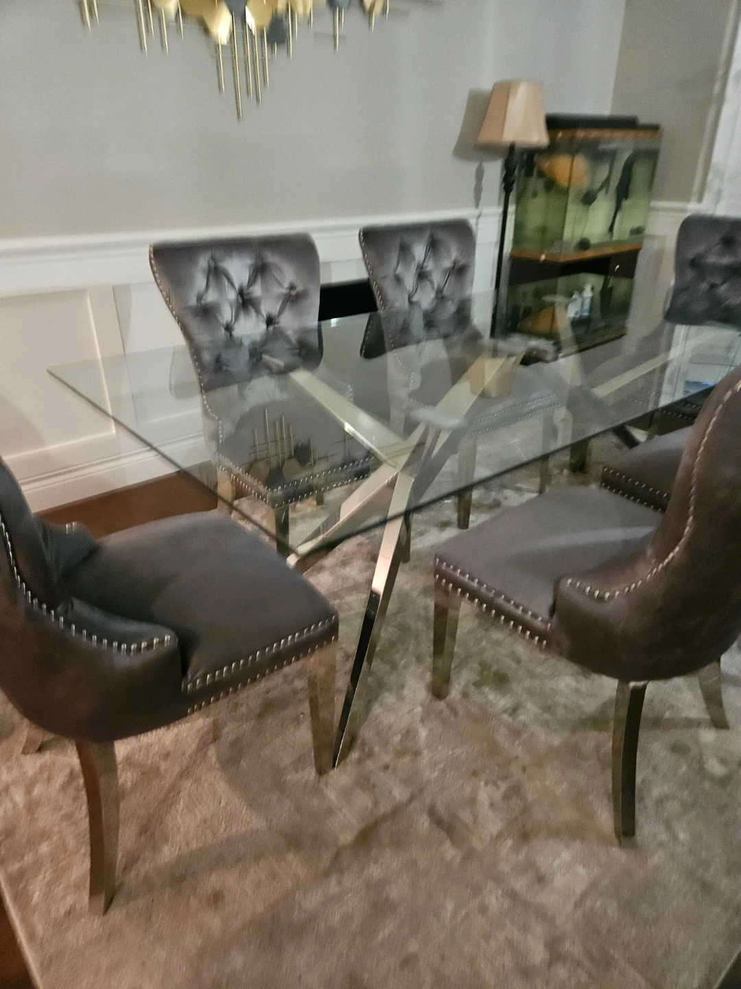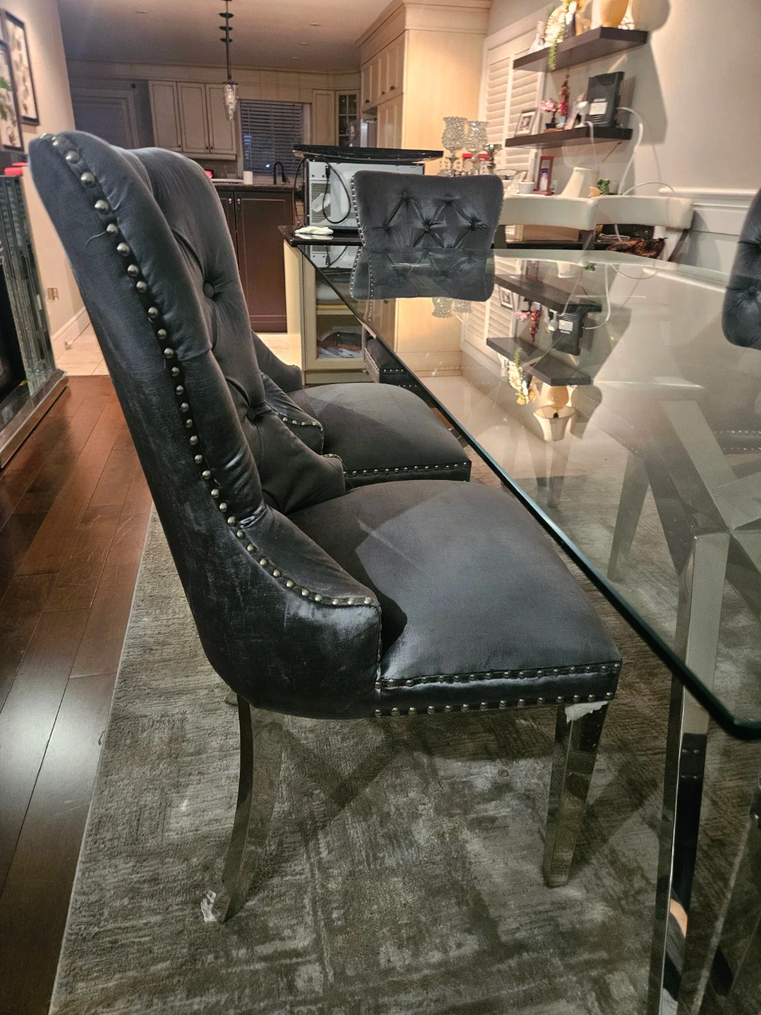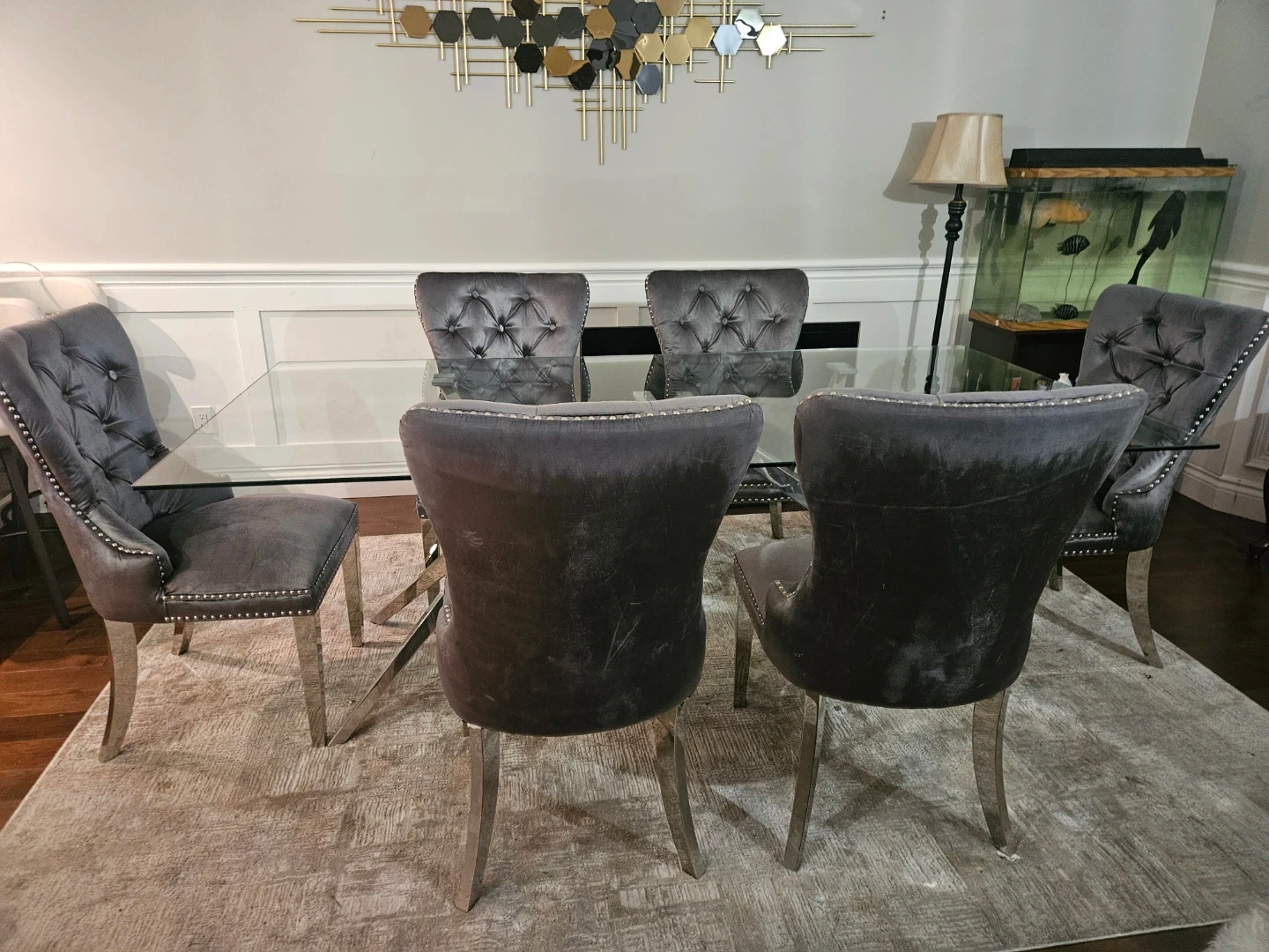 A stylish glass-top dining table with a striking chrome base, paired with six comfortable grey velvet tufted chairs. The chairs feature silver nailhead trim and chrome legs. Seats six people comfortably.