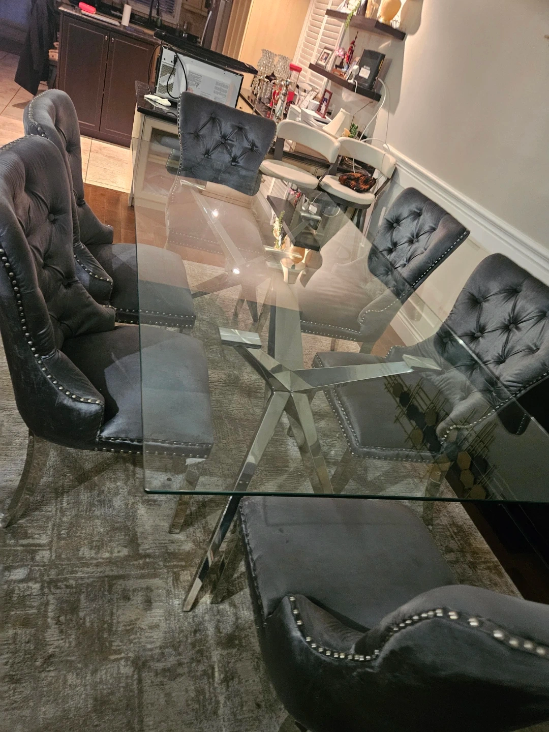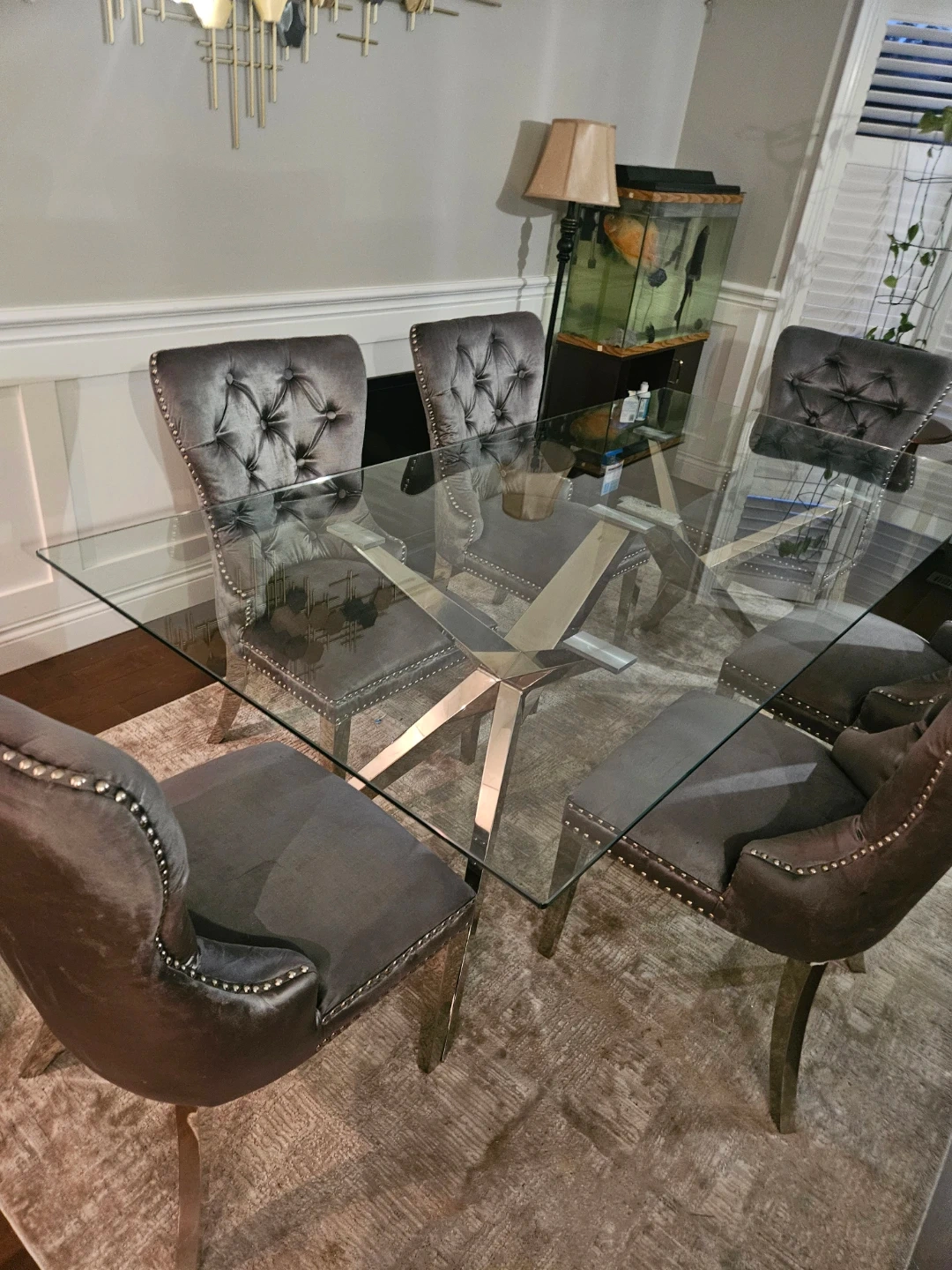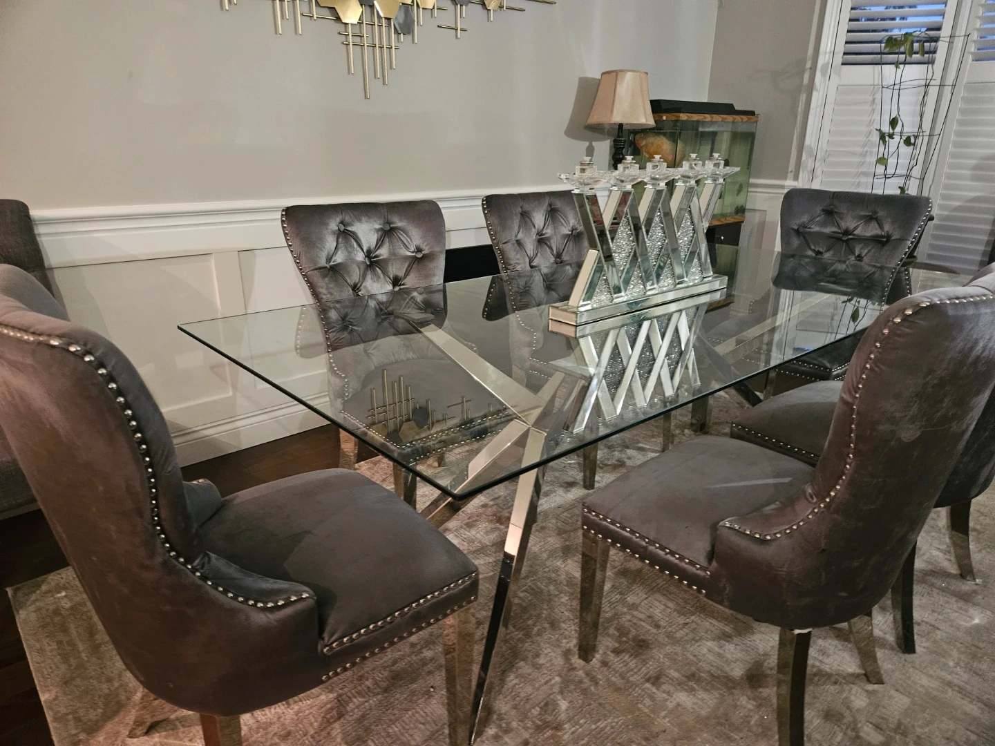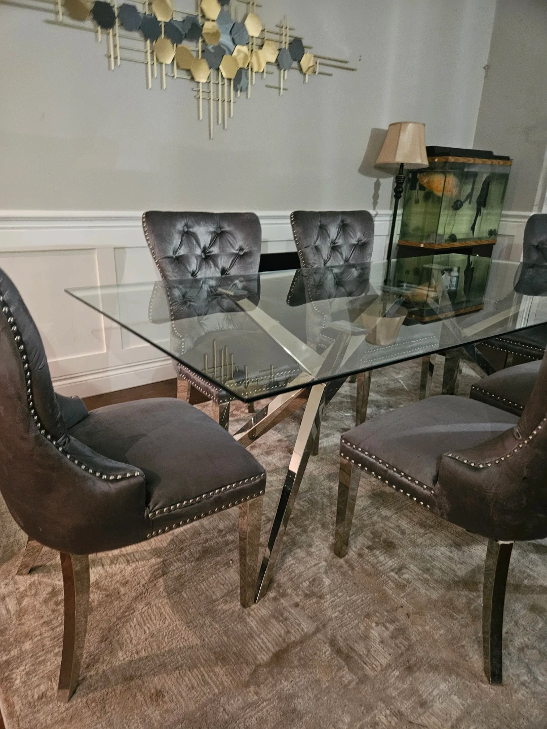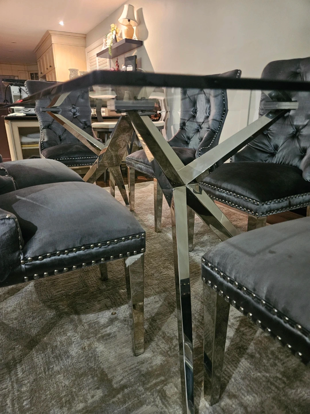 A stylish glass-top dining table with a striking chrome base, paired with six comfortable grey velvet tufted chairs. The chairs feature silver nailhead trim and chrome legs. Seats six people comfortably.