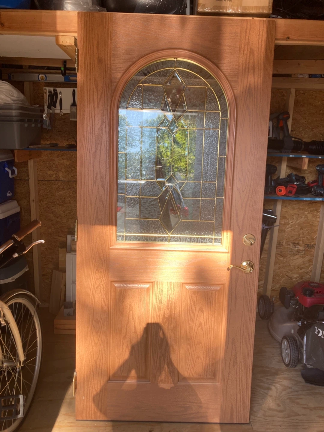 This is a wooden exterior slab door with an arched window featuring decorative glass. It includes a gold-tone handle and lockset. The wood grain finish provides a classic look.