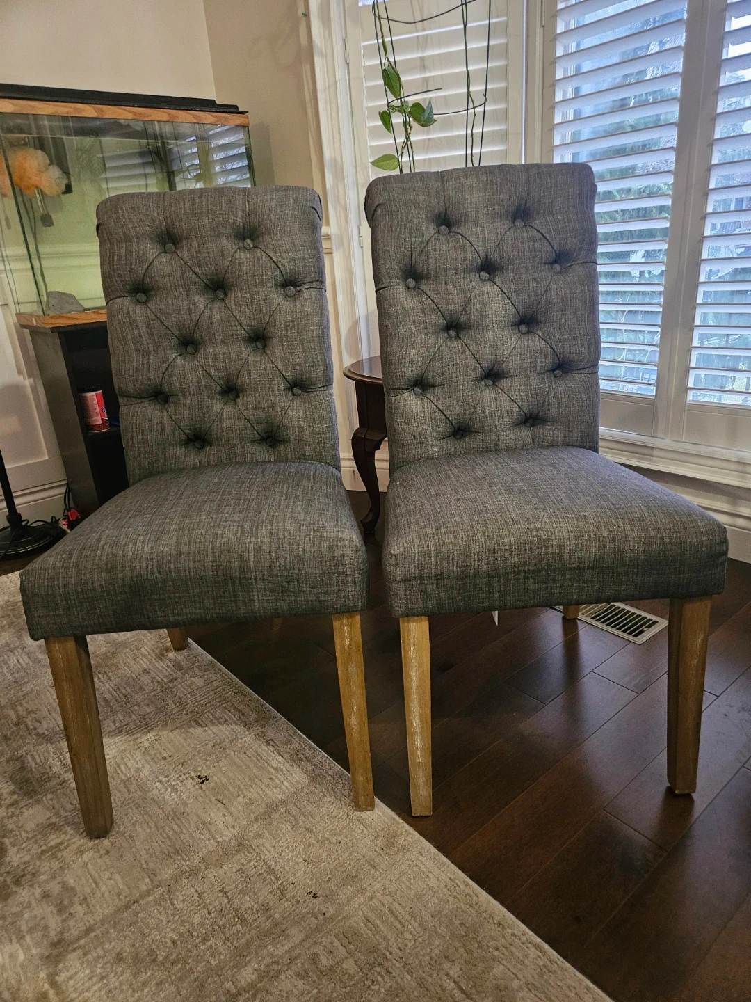 These two grey upholstered dining chairs feature a tufted backrest and wooden legs. The fabric appears to be a durable blend. Perfect for adding a touch of elegance to your dining space. They're comfortable and sturdy!