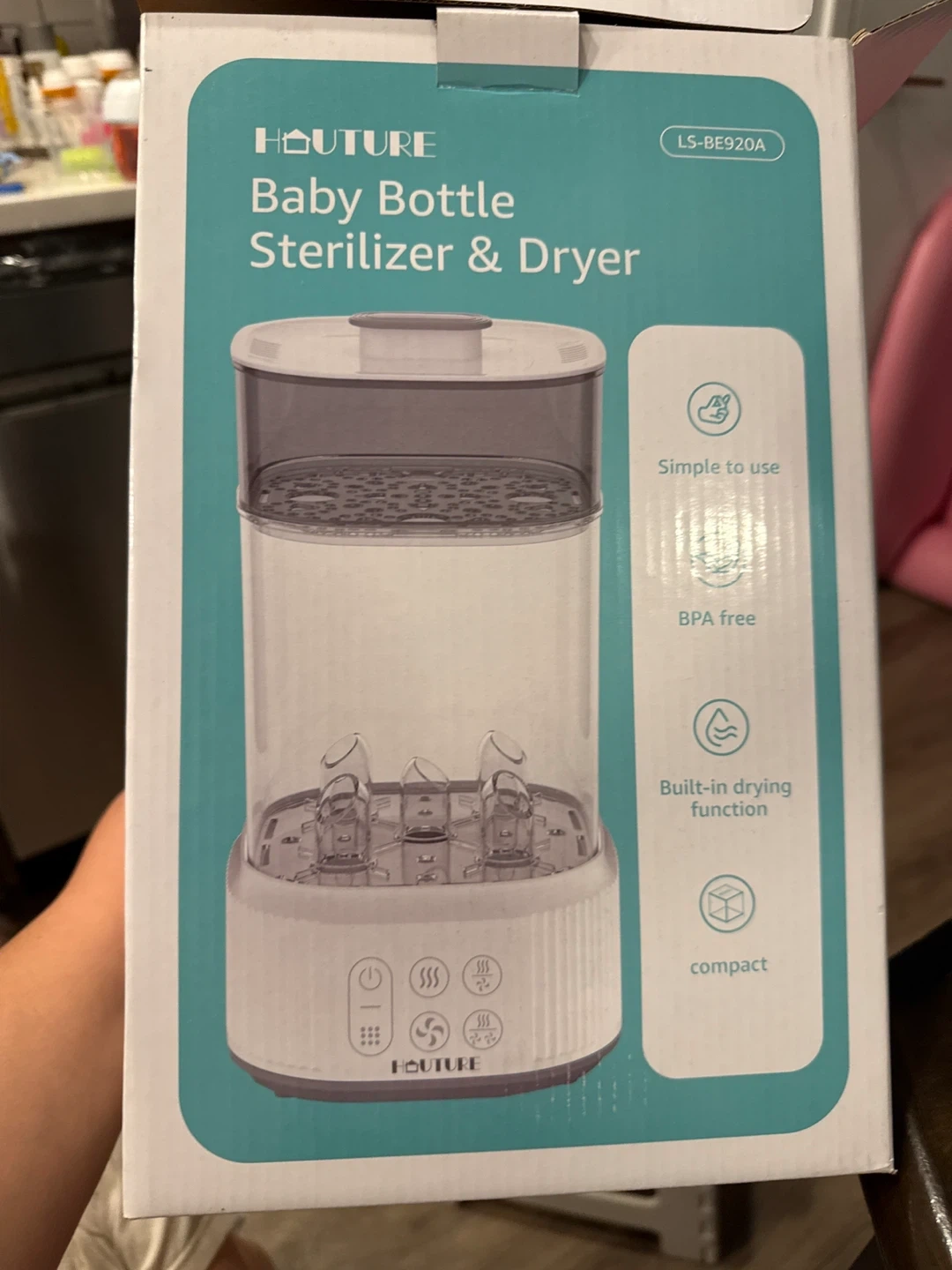 This Houture sterilizer and dryer effectively sanitizes and dries baby bottles. It uses high-temperature steam for thorough disinfection. It includes a steaming rack and drying fan.