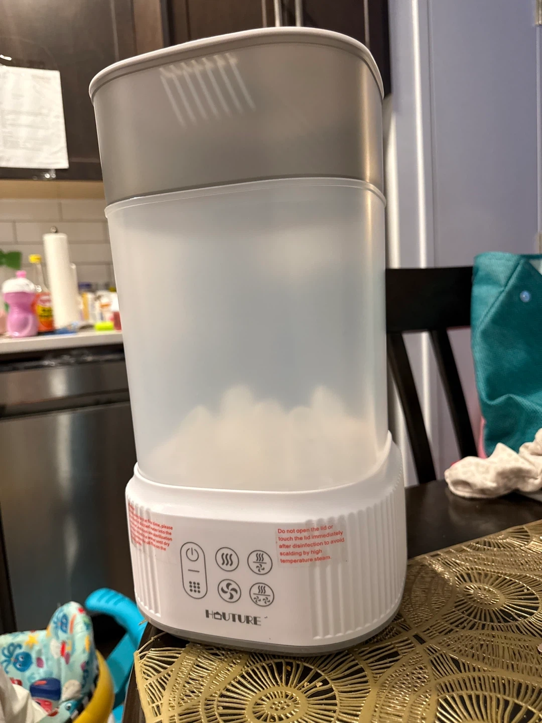 This Houture sterilizer and dryer effectively sanitizes and dries baby bottles. It uses high-temperature steam for thorough disinfection. It includes a steaming rack and drying fan.