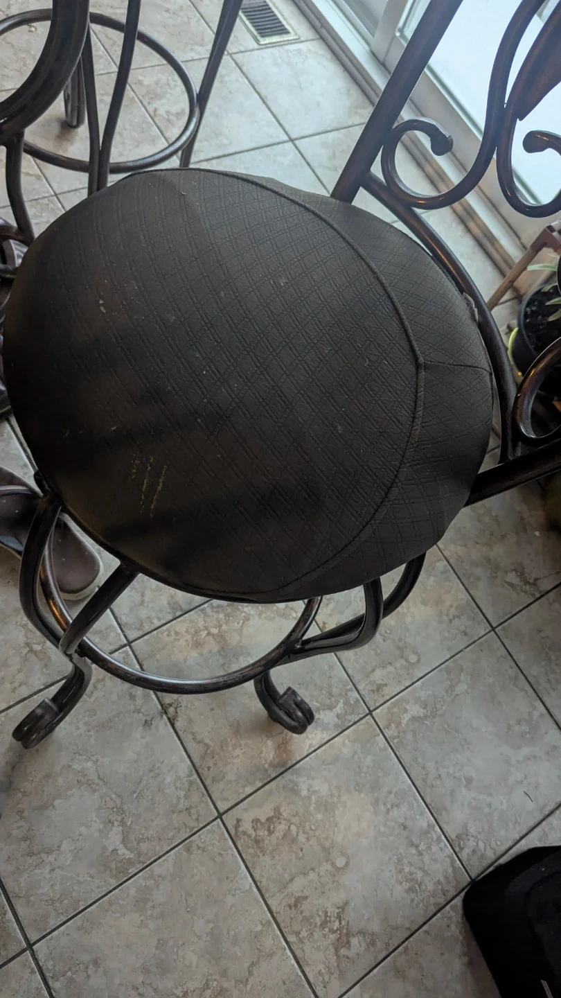 This is a black upholstered swivel bar stool. It features a dark fabric seat with a textured pattern. The stool has a metal frame with decorative scrollwork. It's a comfortable seating option for a kitchen island or bar area.