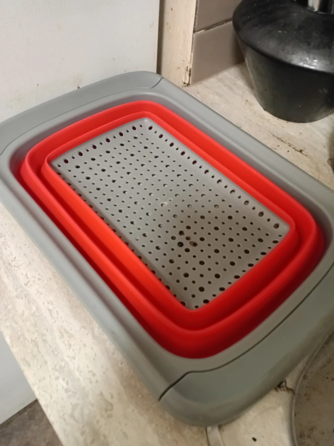 This is a collapsible colander for draining and washing produce. It folds flat for easy storage. It's made of durable plastic and silicone. When folded, it's super compact!
