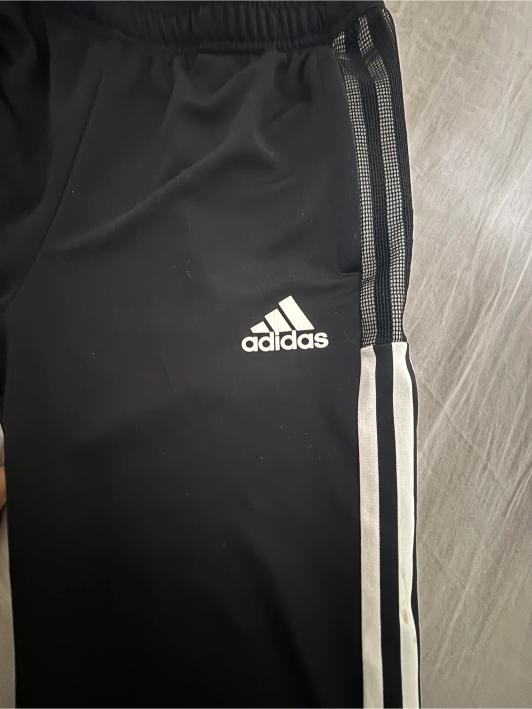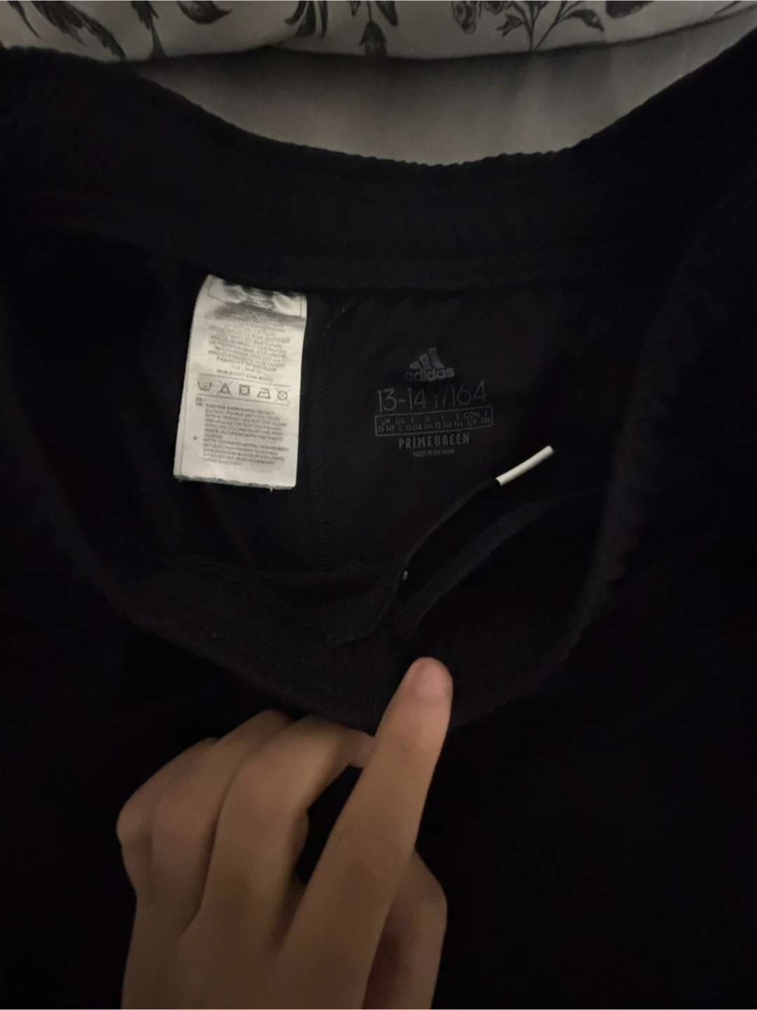 Black Adidas track pants with AEROREADY technology. Size 13-14 years / 164cm. Features classic three-stripe detailing on the sides. Made with Primegreen material.