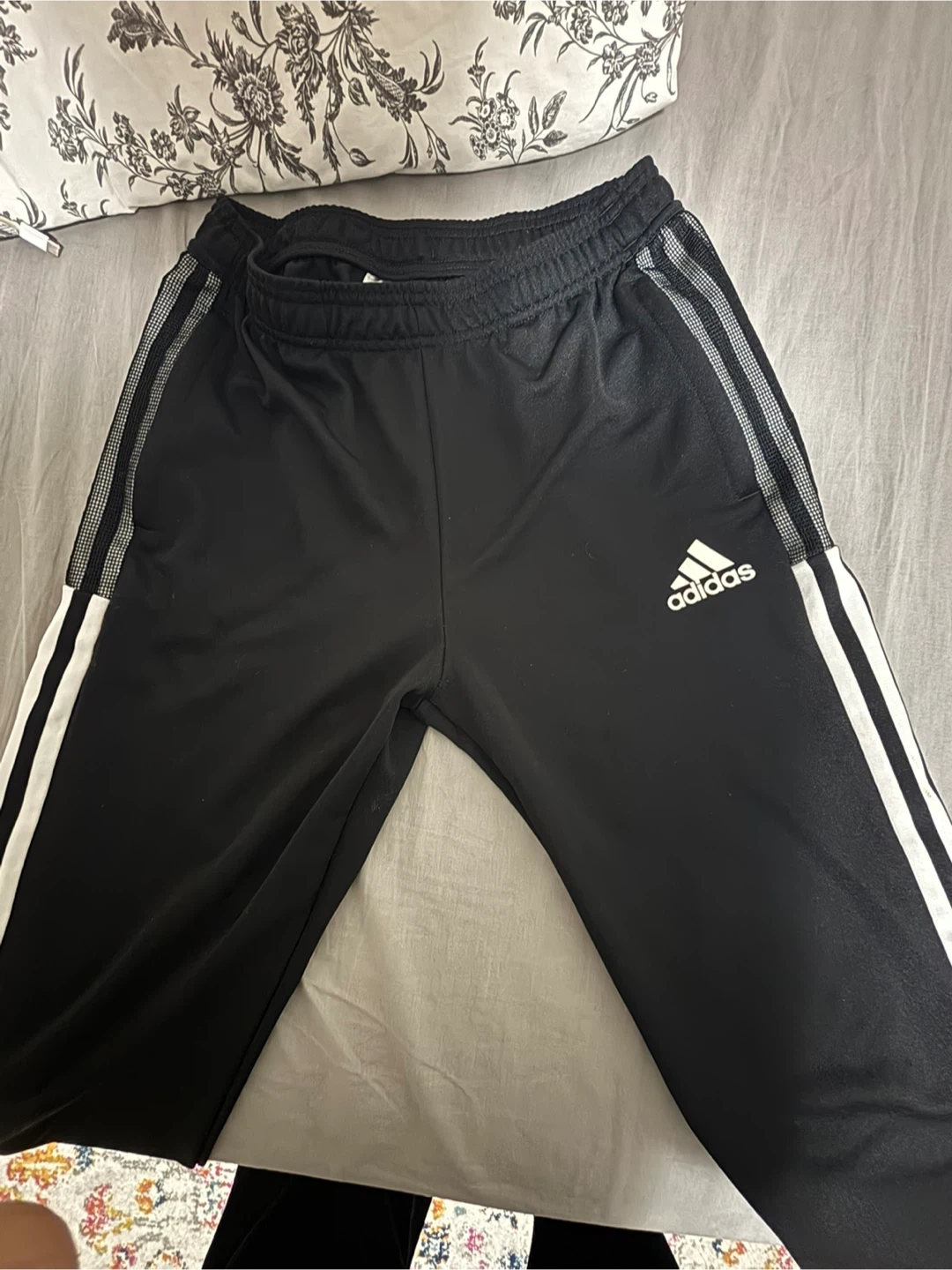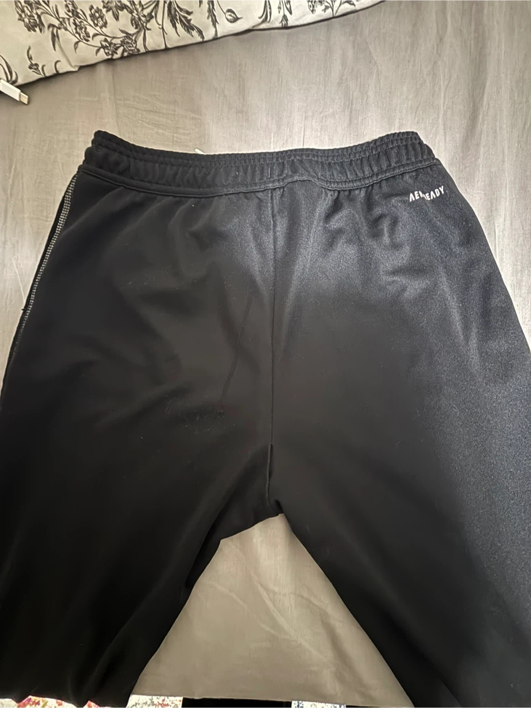 Black Adidas track pants with AEROREADY technology. Size 13-14 years / 164cm. Features classic three-stripe detailing on the sides. Made with Primegreen material.