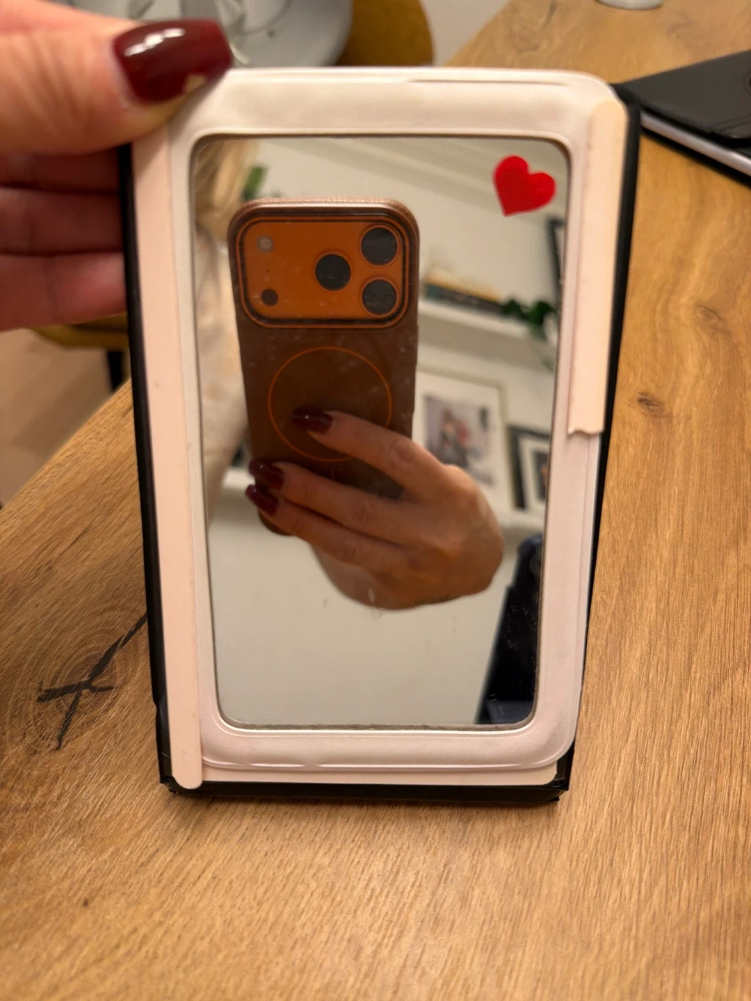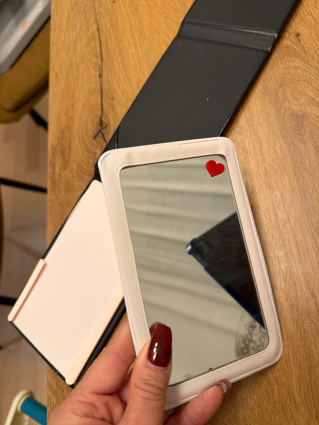 This is a Mary Kay compact mirror with a black exterior and a stand. The interior mirror is removable. Perfect for touch-ups on the go!