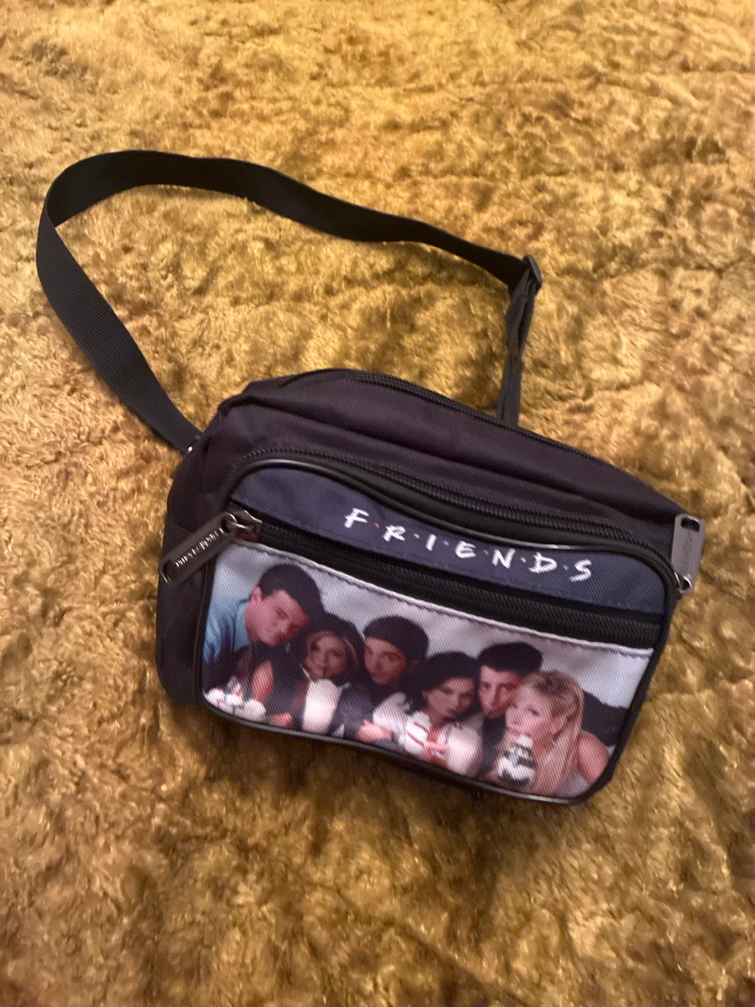 This black fanny pack features the main cast of Friends printed on the front. It has a zippered main compartment and an adjustable strap. Great for any fan of the show!