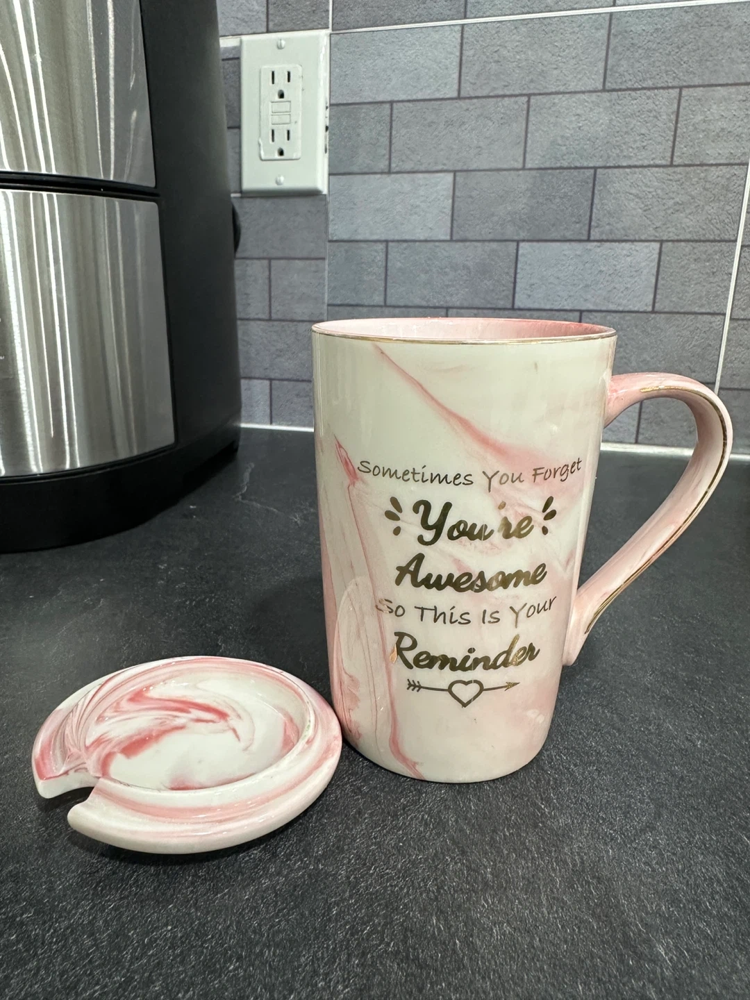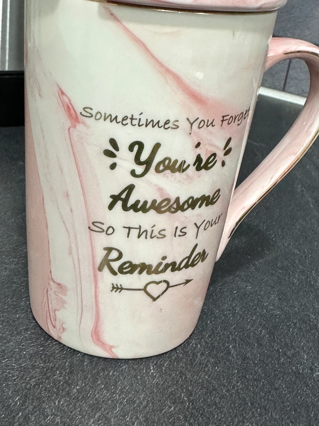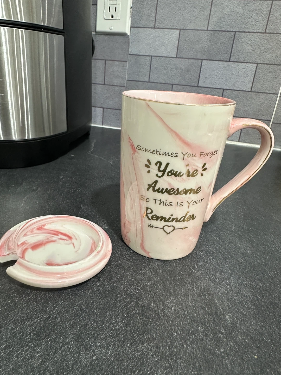 This ceramic mug features a pink and white marble swirl design. It includes a matching lid with a slot for a spoon. The mug has a heartwarming message: 'Sometimes You Forget You're Awesome, So This Is Your Reminder'. It's a great way to start your day with a positive thought!