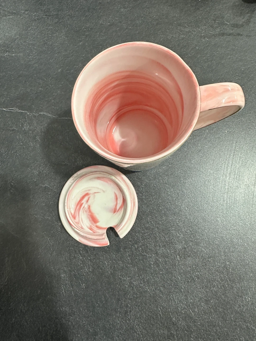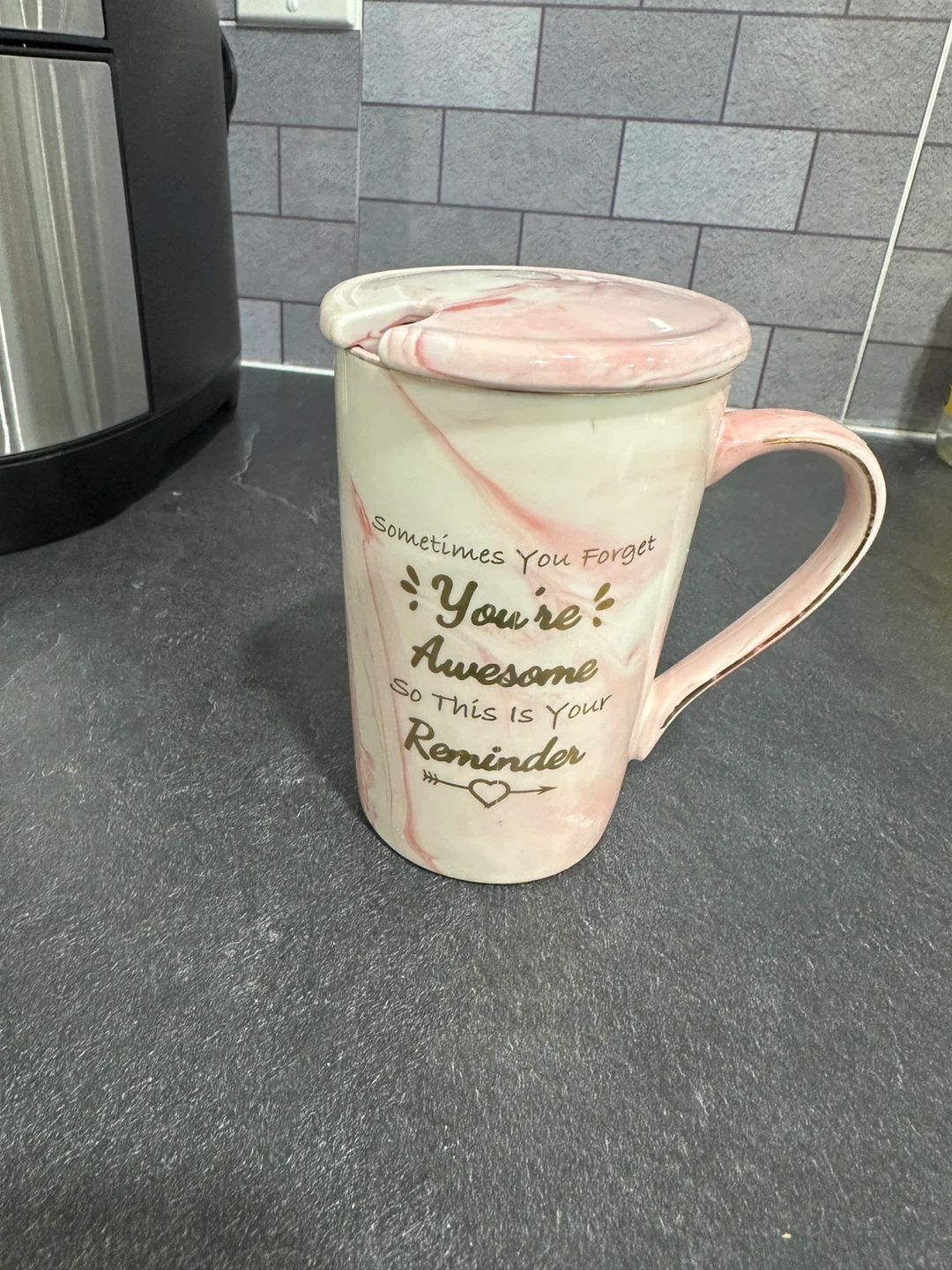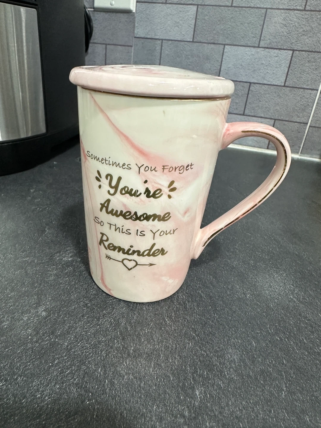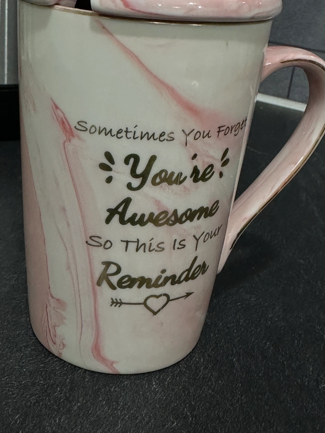 This ceramic mug features a pink and white marble swirl design. It includes a matching lid with a slot for a spoon. The mug has a heartwarming message: 'Sometimes You Forget You're Awesome, So This Is Your Reminder'. It's a great way to start your day with a positive thought!