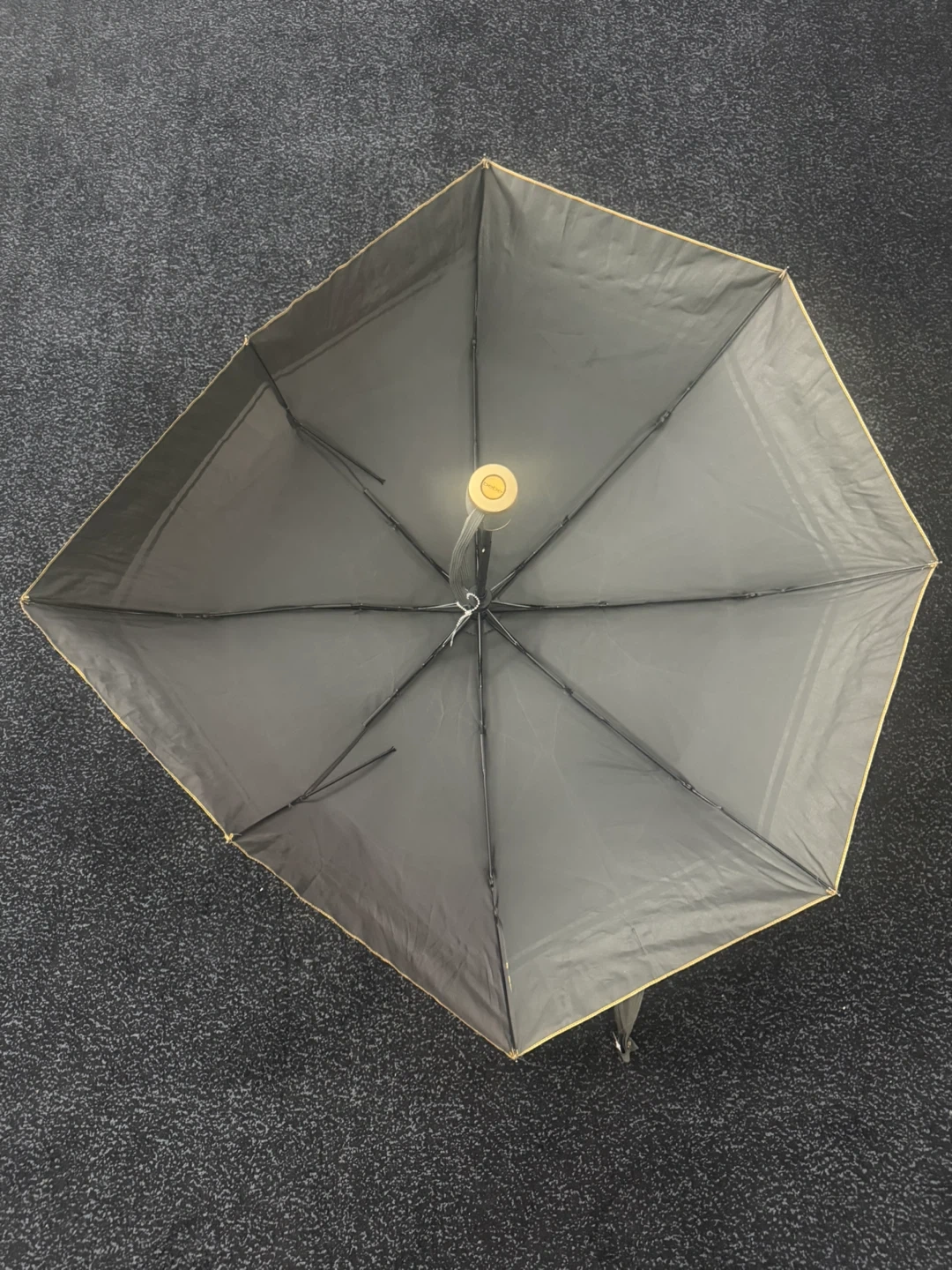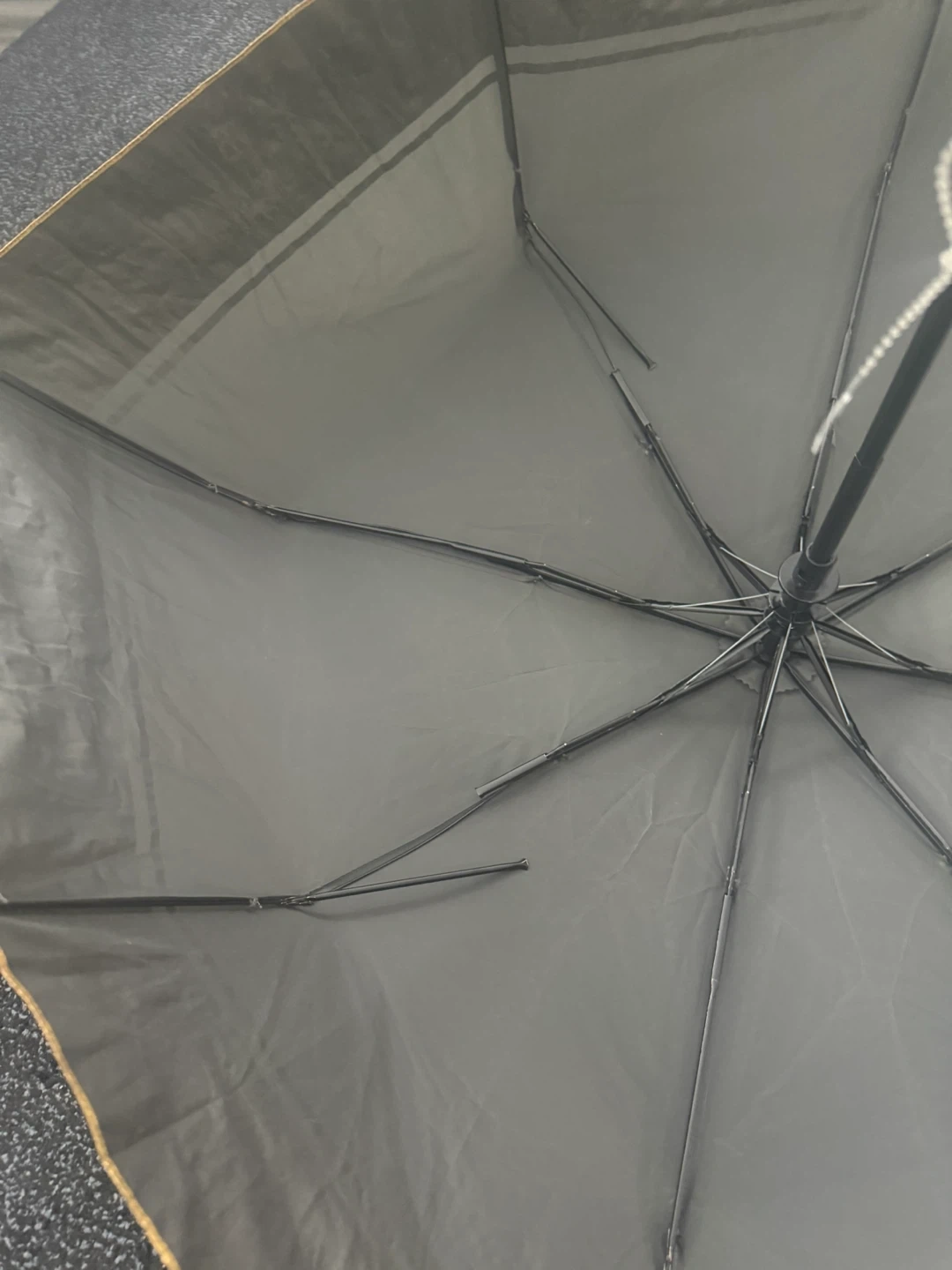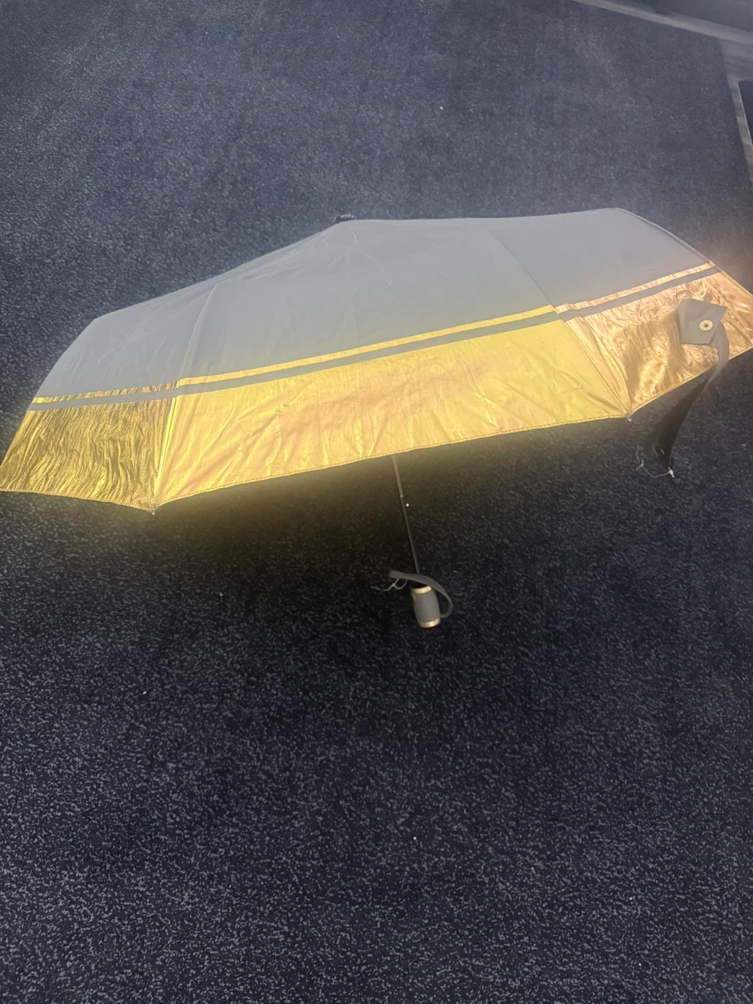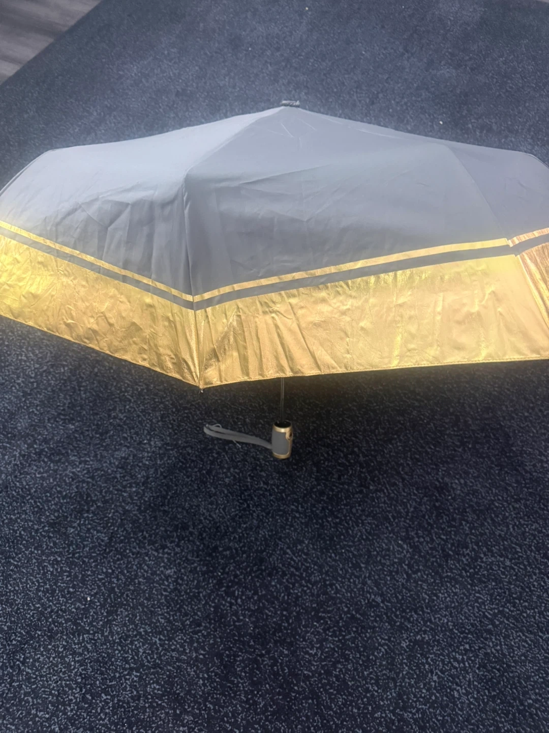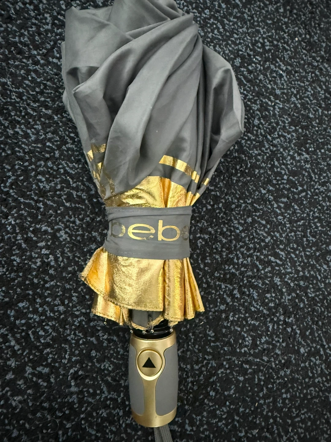 This is a grey and gold Bebe umbrella. It's a compact, foldable design. It has a gold band around the handle when closed.