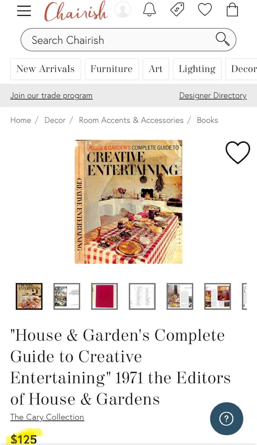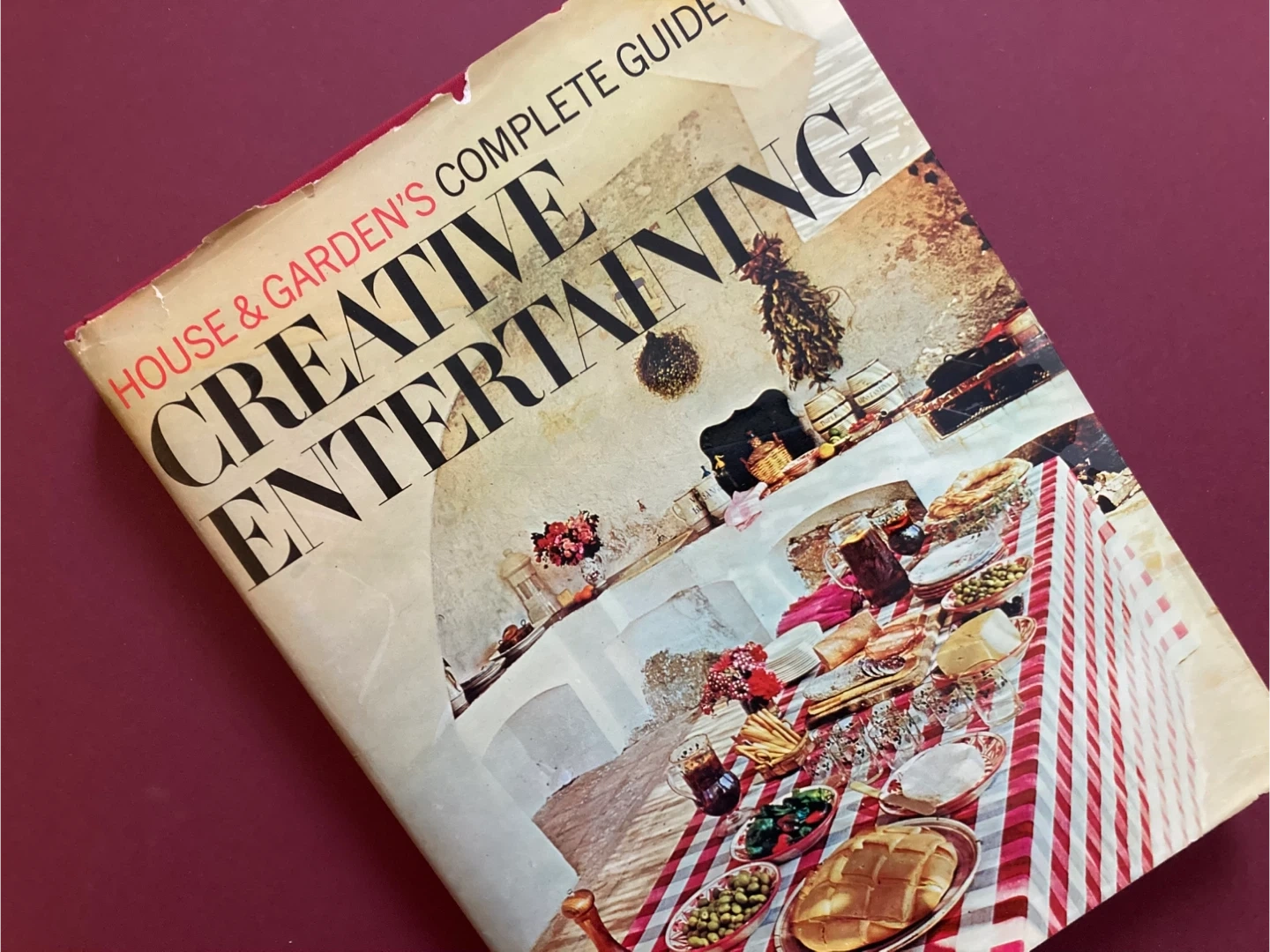 "House & Garden's Complete Guide to Creative Entertaining" 1971. This vintage book offers insights and ideas for hosting parties, setting tables, and creating a stylish atmosphere. Amazing resource of mid-century decor, design, and home trends. Filled with photos on almost every page There is some wear and tear on the dust jacket consistent with age and some writing on the inside cover from its previous owner, but otherwise in very good condition. Selling on online marketplaces like Chairish for $125 US.
