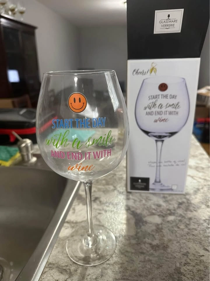 Two novelty wine glasses that hold one bottle of wine each. One says “you can’t buy happiness but you can buy wine” and the other says “start the day with a smile and end it with wine.” Comes with box - never used; from a smoke free and pet free home. Pick up in Barrie.