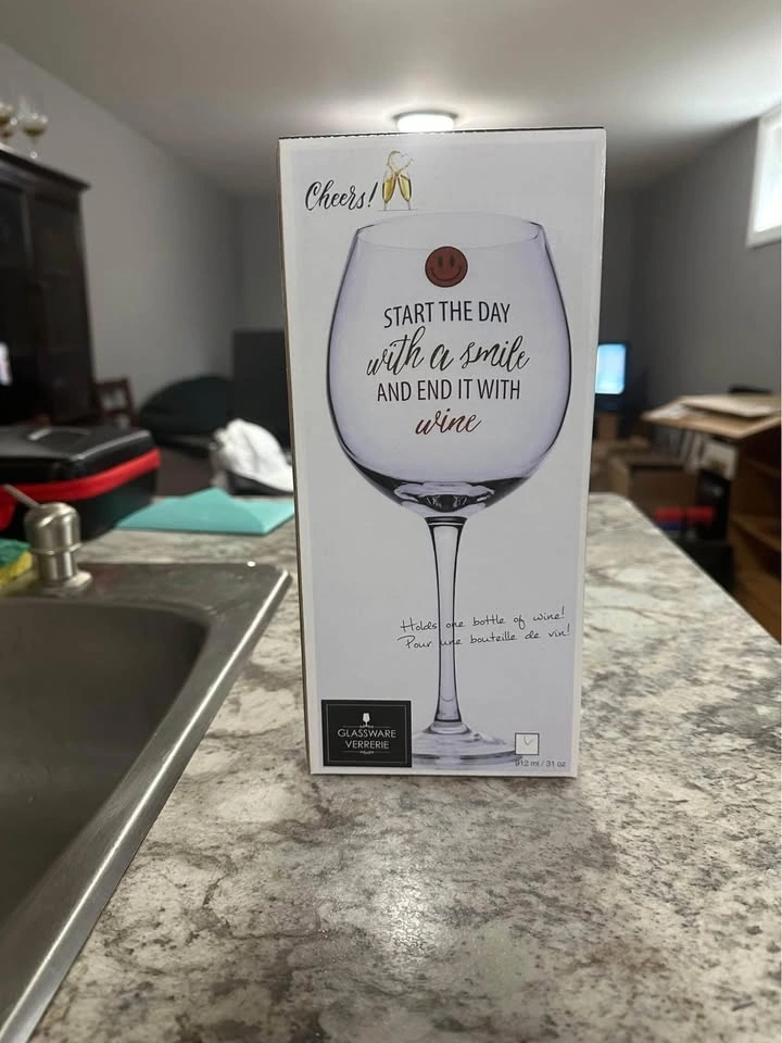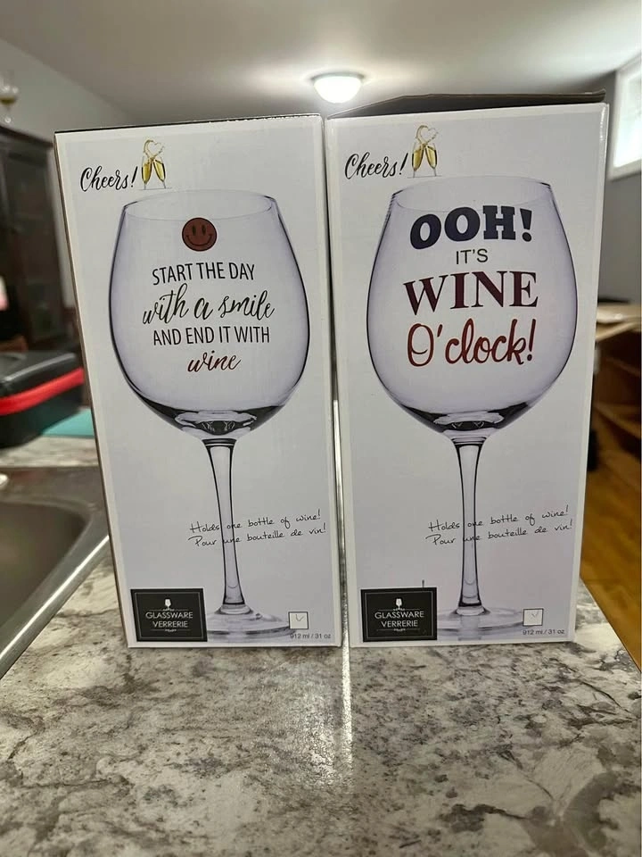 Two novelty wine glasses that hold one bottle of wine each. One says “you can’t buy happiness but you can buy wine” and the other says “start the day with a smile and end it with wine.” Comes with box - never used; from a smoke free and pet free home. Pick up in Barrie.
