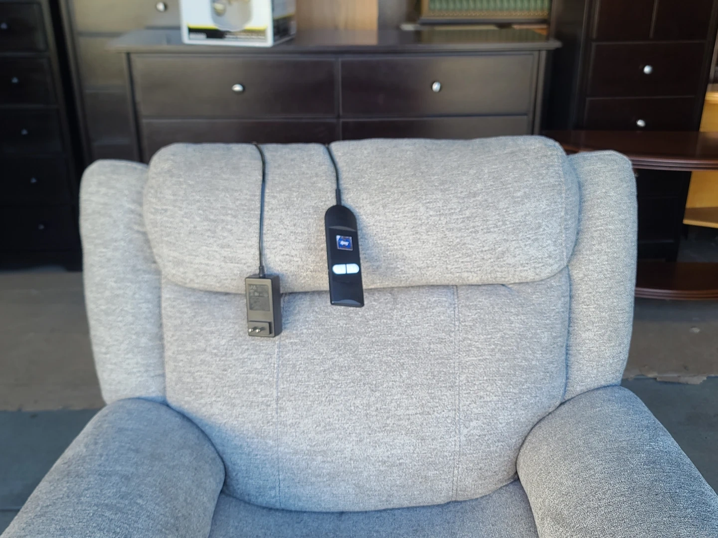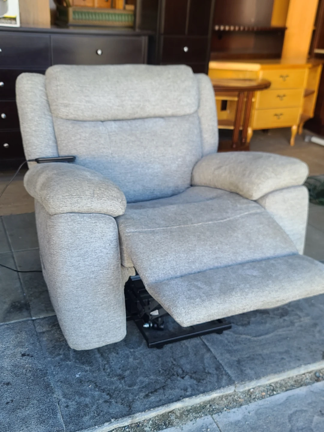 Comfortable Power Recliner Chair in light grey fabric. Features smooth electric reclining with wired remote control, plush cushioning, and wide armrests. Clean, well-maintained, and fully functional. Smoke-free home. Measurements to follow. Delivery can be arranged. Viewing and pickup by appointment.