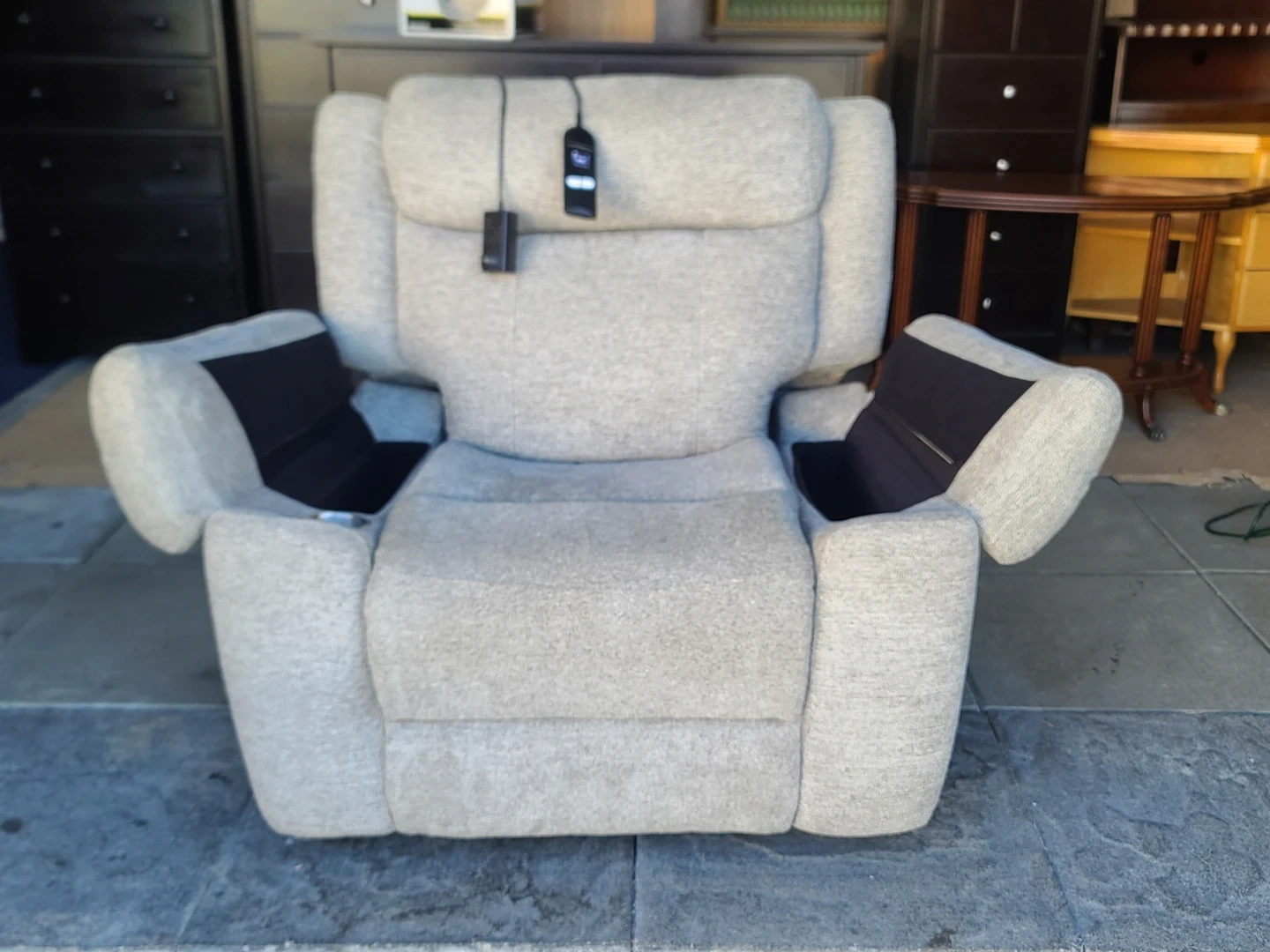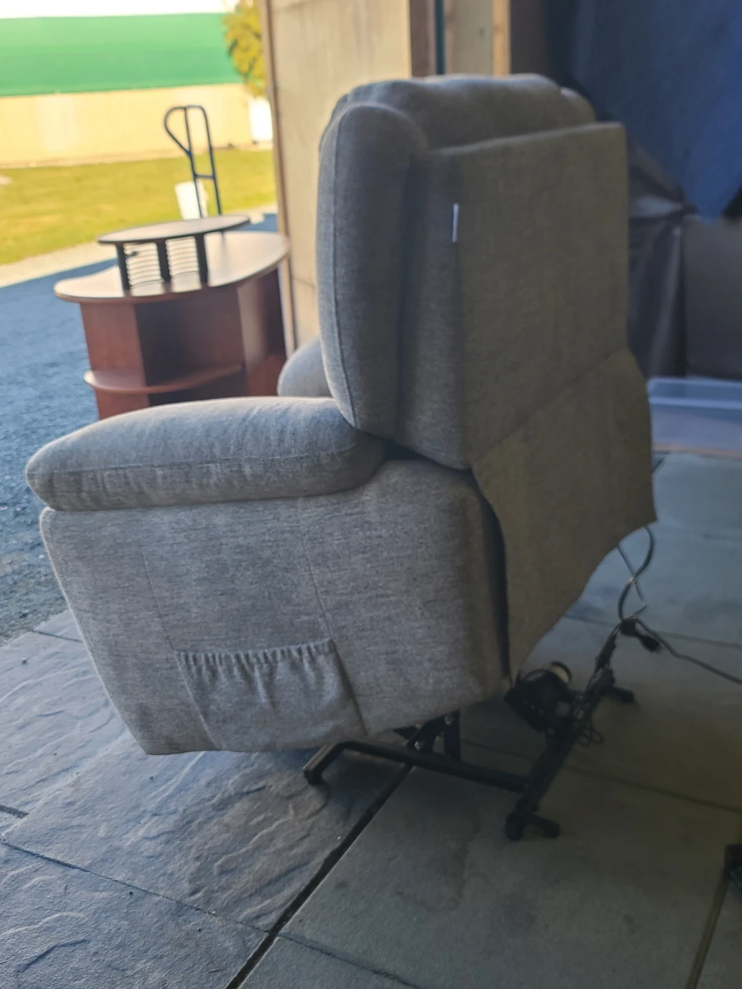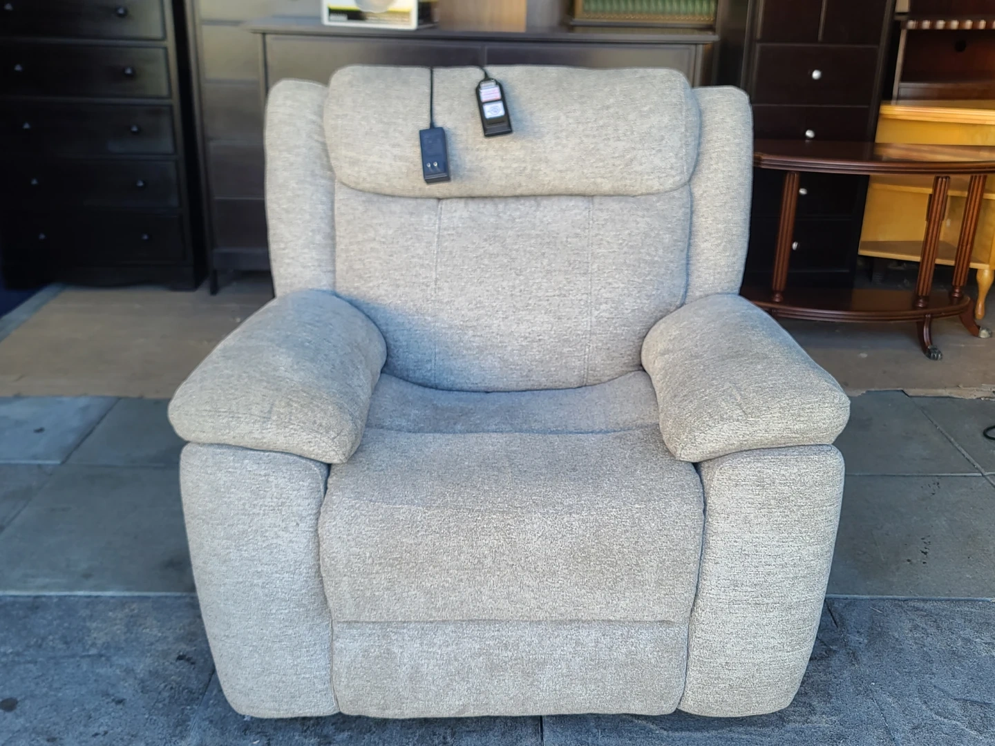 Comfortable Power Recliner Chair in light grey fabric. Features smooth electric reclining with wired remote control, plush cushioning, and wide armrests. Clean, well-maintained, and fully functional. Smoke-free home. Measurements to follow. Delivery can be arranged. Viewing and pickup by appointment.