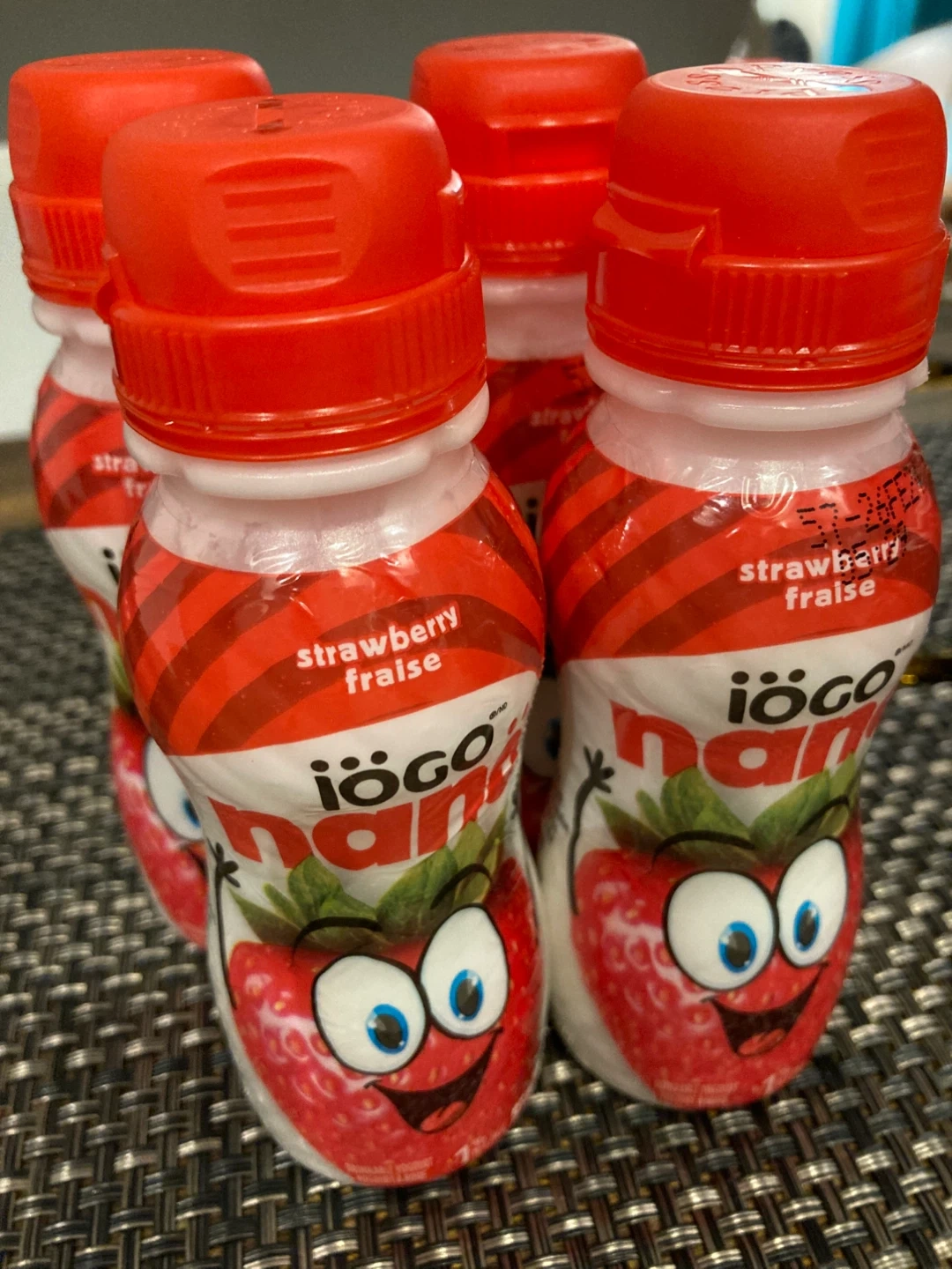 New, unopened iögo nano strawberry fraise drinkable yogurt. This is a pack of four individual bottles. Perfect for a quick snack! $1 for all