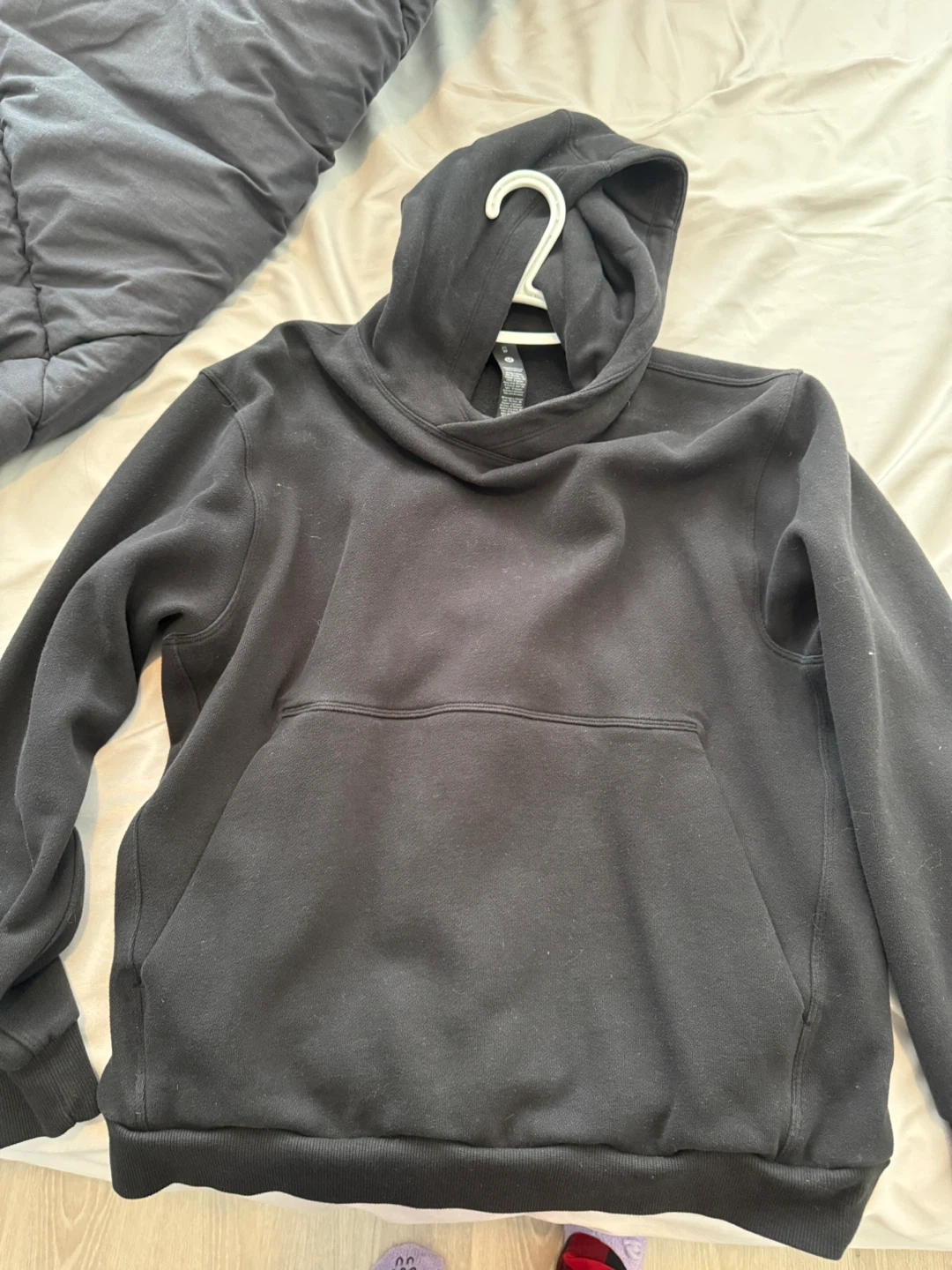 This is a Lululemon black hoodie with a kangaroo pocket. It's made of a soft cotton blend. Size is 4.