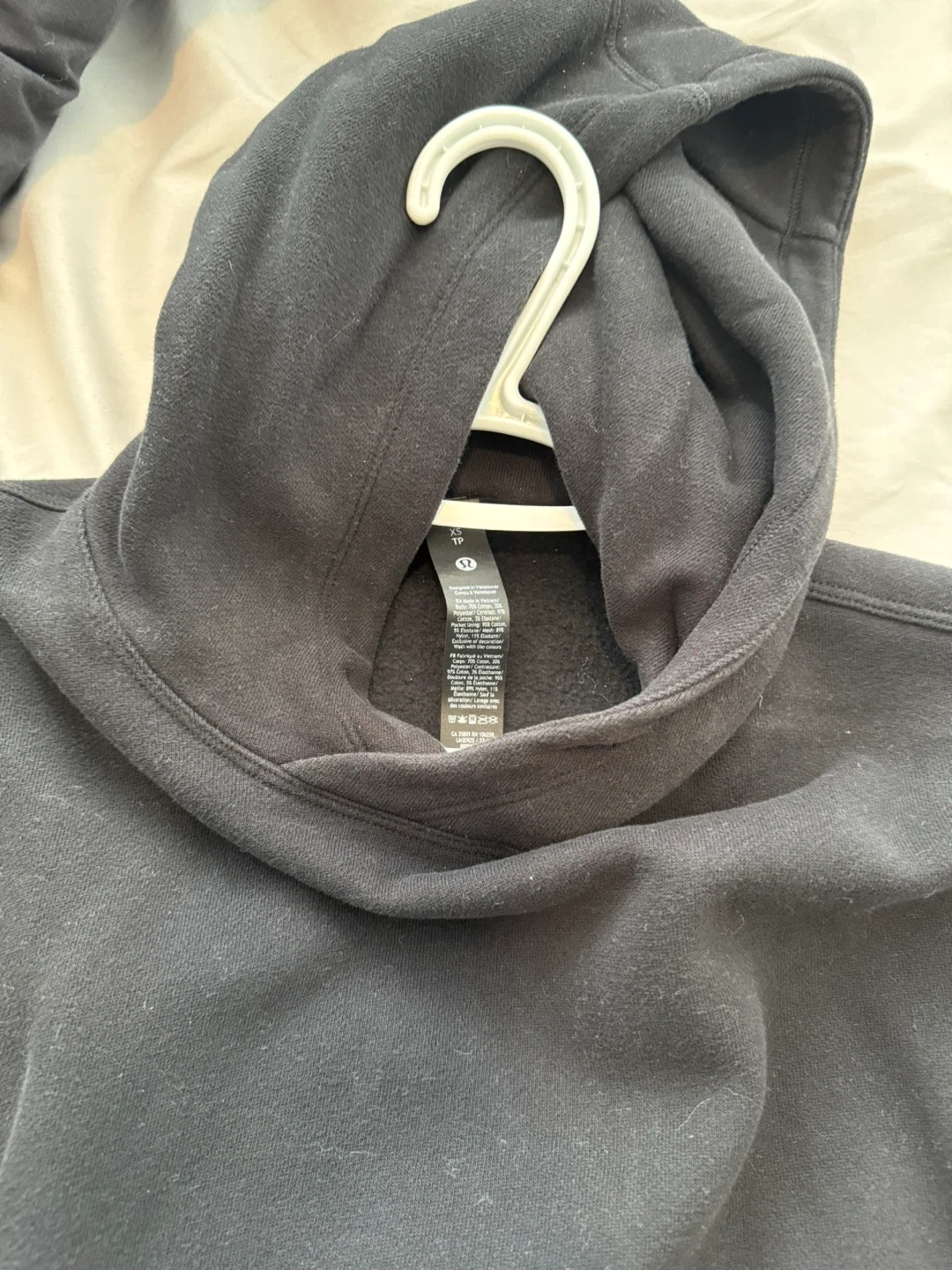 This is a Lululemon black hoodie with a kangaroo pocket. It's made of a soft cotton blend. Size is 4.