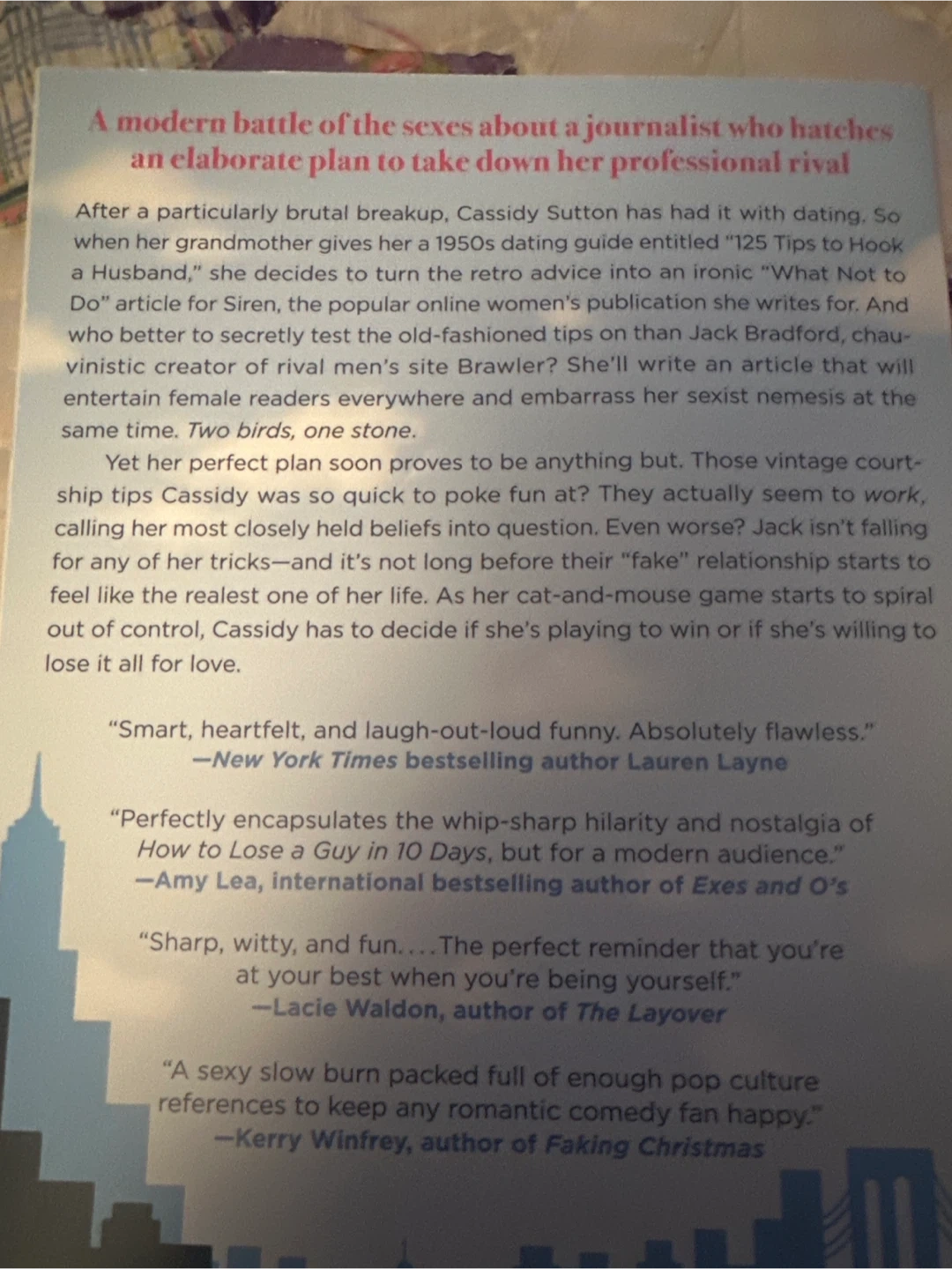A modern battle of the sexes about a journalist who hatches an elaborate plan to take down her professional rival. After a particularly brutal breakup, Cassidy Sutton has had it with dating. When her grandmother gives her a 1950s dating guide entitled "125 Tips to Hook a Husband," she decides to turn the retro advice into an article where she writes for. This novel is perfect for fans of witty romance and contemporary fiction.