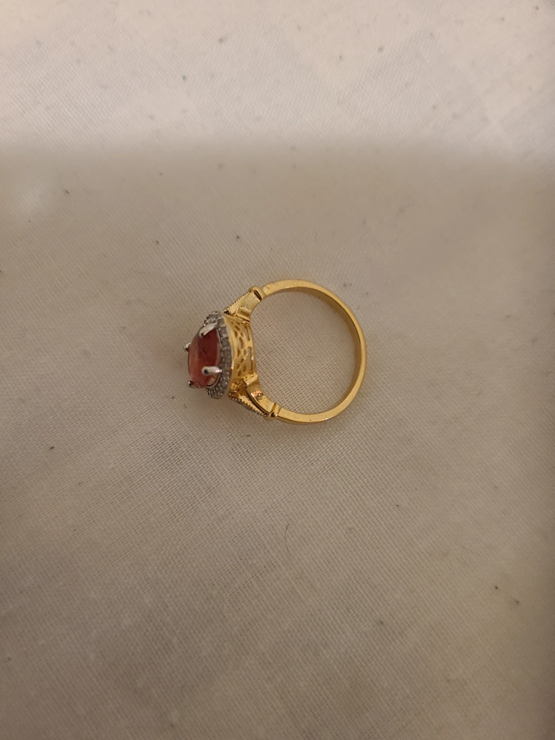 This elegant ring features a prominent red gemstone surrounded by a halo of cubic zirconia. The band is crafted from gold-tone metal with intricate detailing. It's a lovely accessory for any occasion!