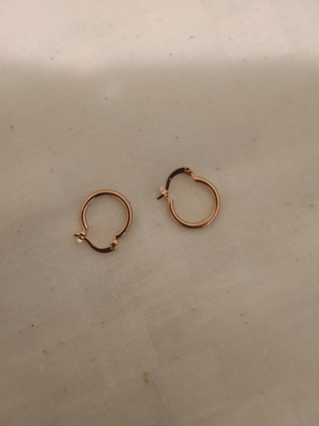 A pair of rose gold hoop earrings. These earrings are a classic accessory for everyday wear. They're lightweight and comfortable for all-day use.