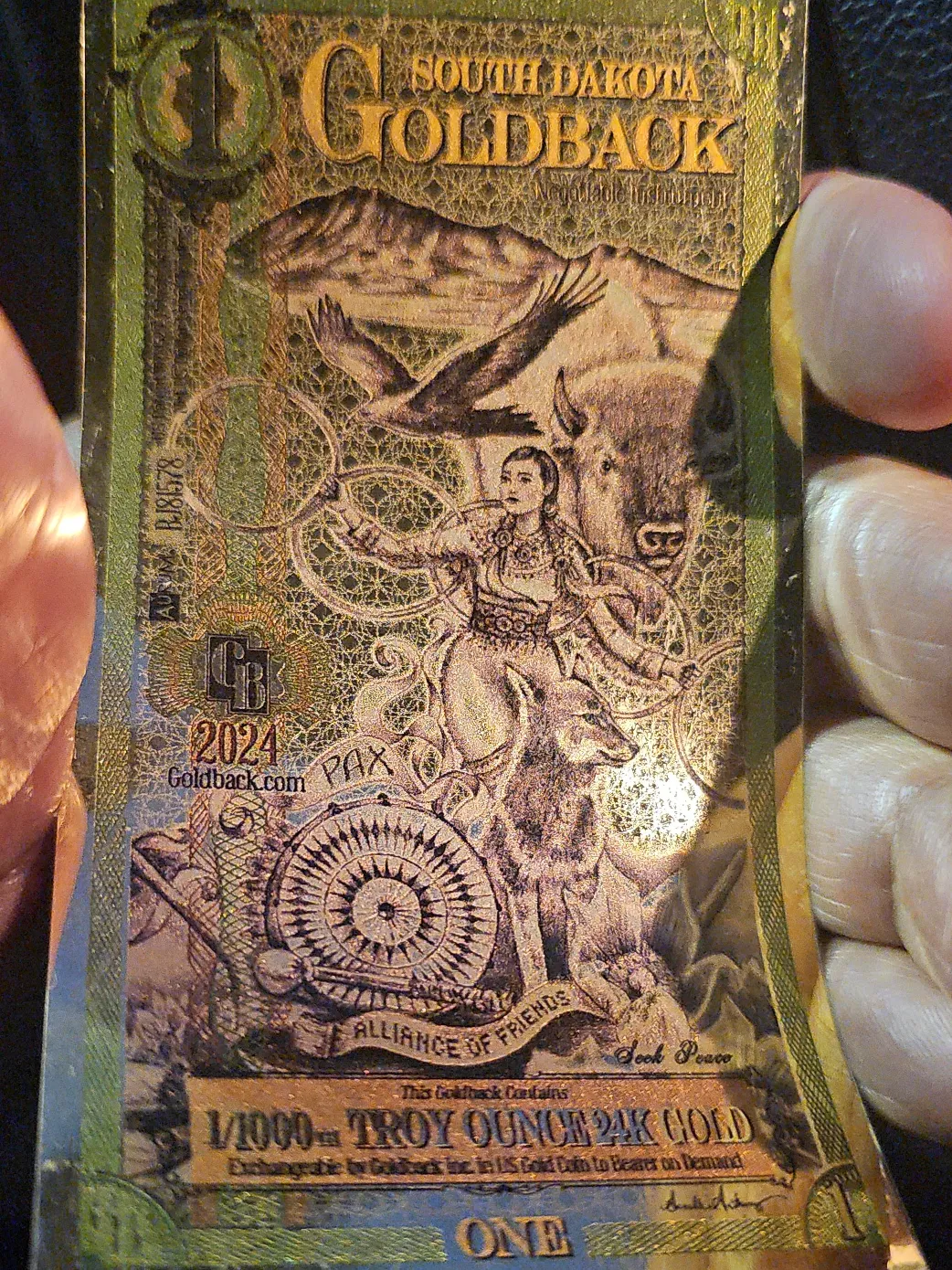 This is a South Dakota Goldback. It contains 1/1000 Troy Ounce of 24K gold. It's exchangeable by Goldback Inc. in US gold coin to bearer on demand. The year is 2024.