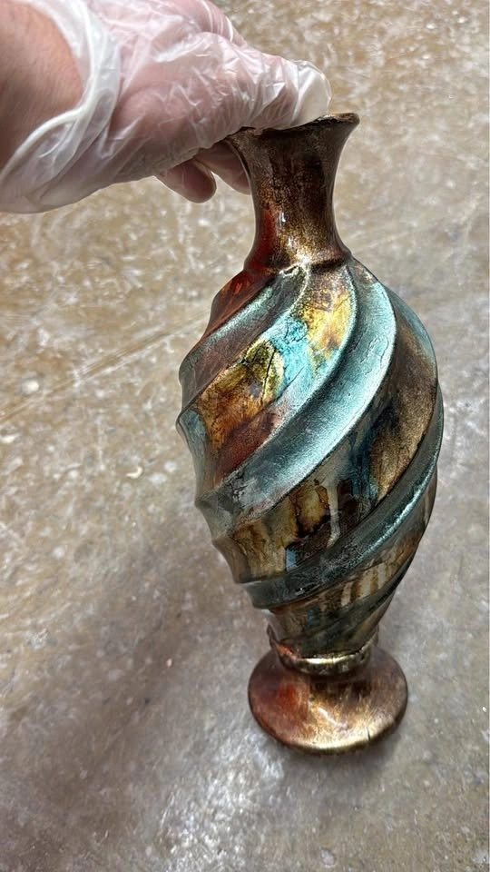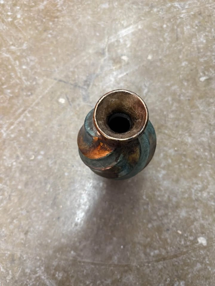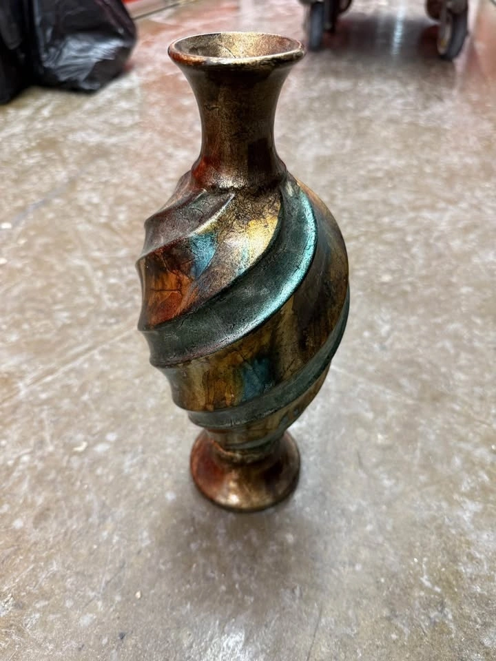 Beautiful ceramic vase with a metallic luster glaze featuring copper, bronze, and turquoise oxidation tones. It has a unique spiral (twisted) body, a narrow neck, and a footed base.