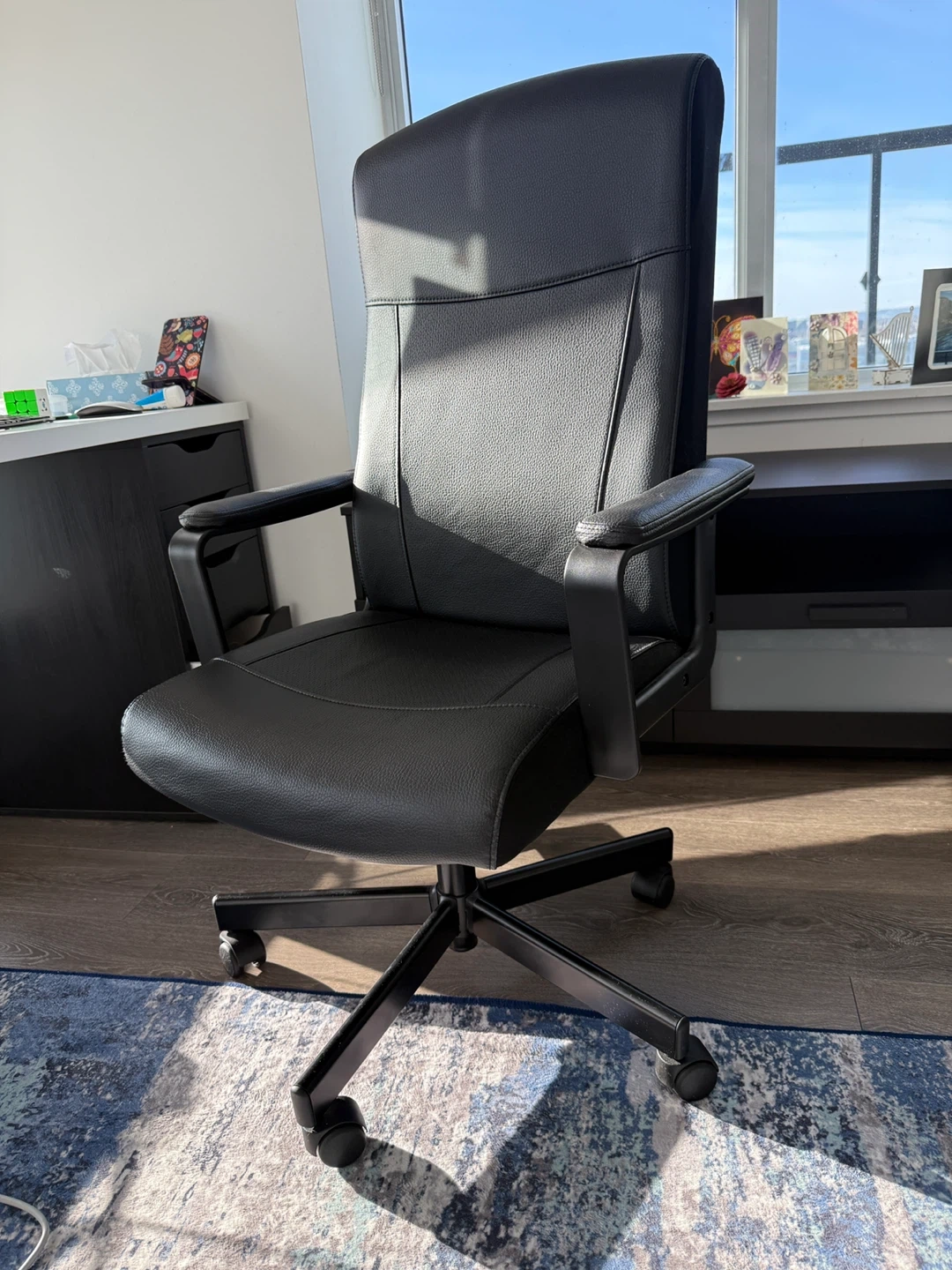 A white and black IKEA Micke desk with a five-drawer unit. It's a great workspace solution for small spaces. The desk is 105cm wide.