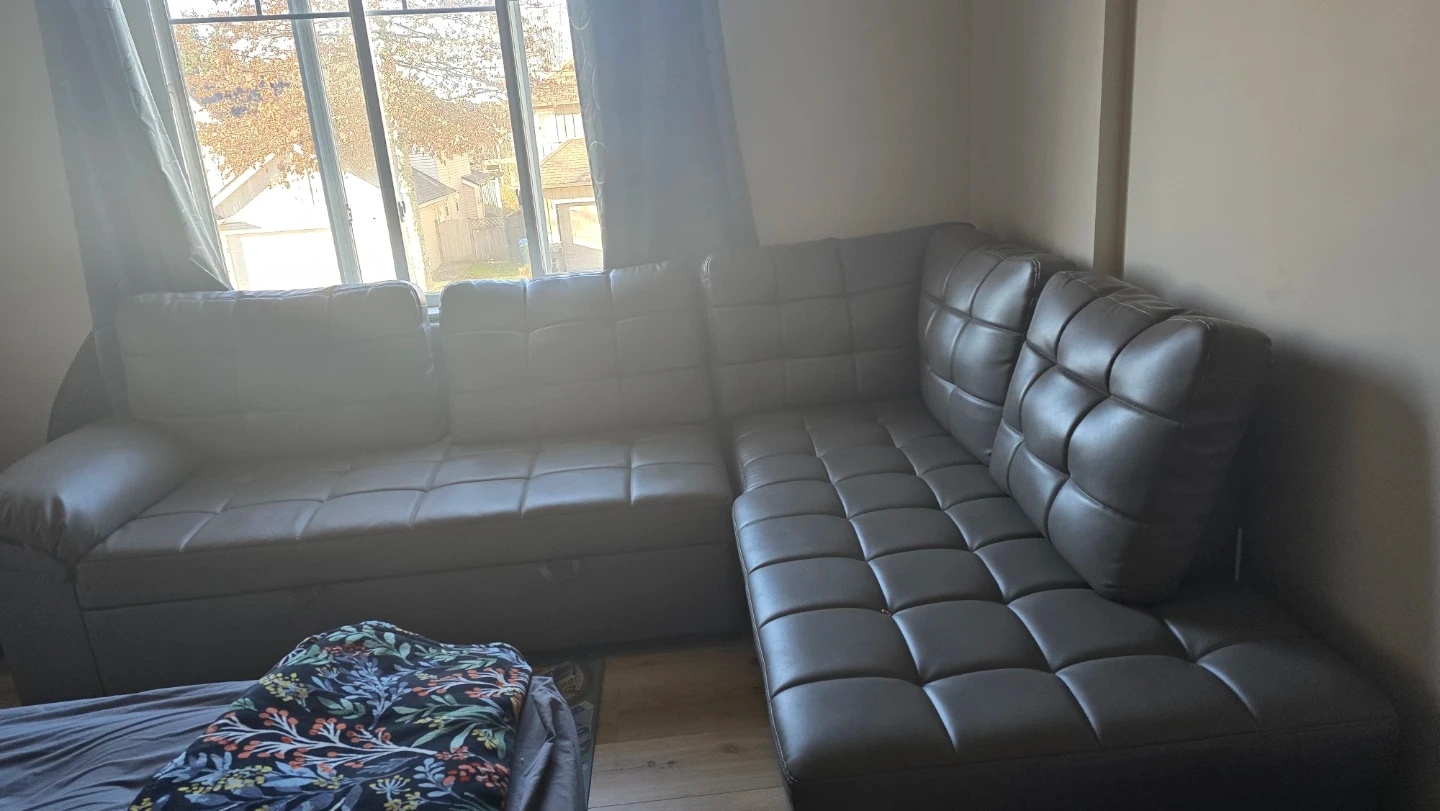This sectional sofa offers a comfy seating and storage solution. It's upholstered in grey faux leather with a tufted seat design. The chaise section lifts to reveal ample storage space. It's perfect for storing extra blankets or pillows!