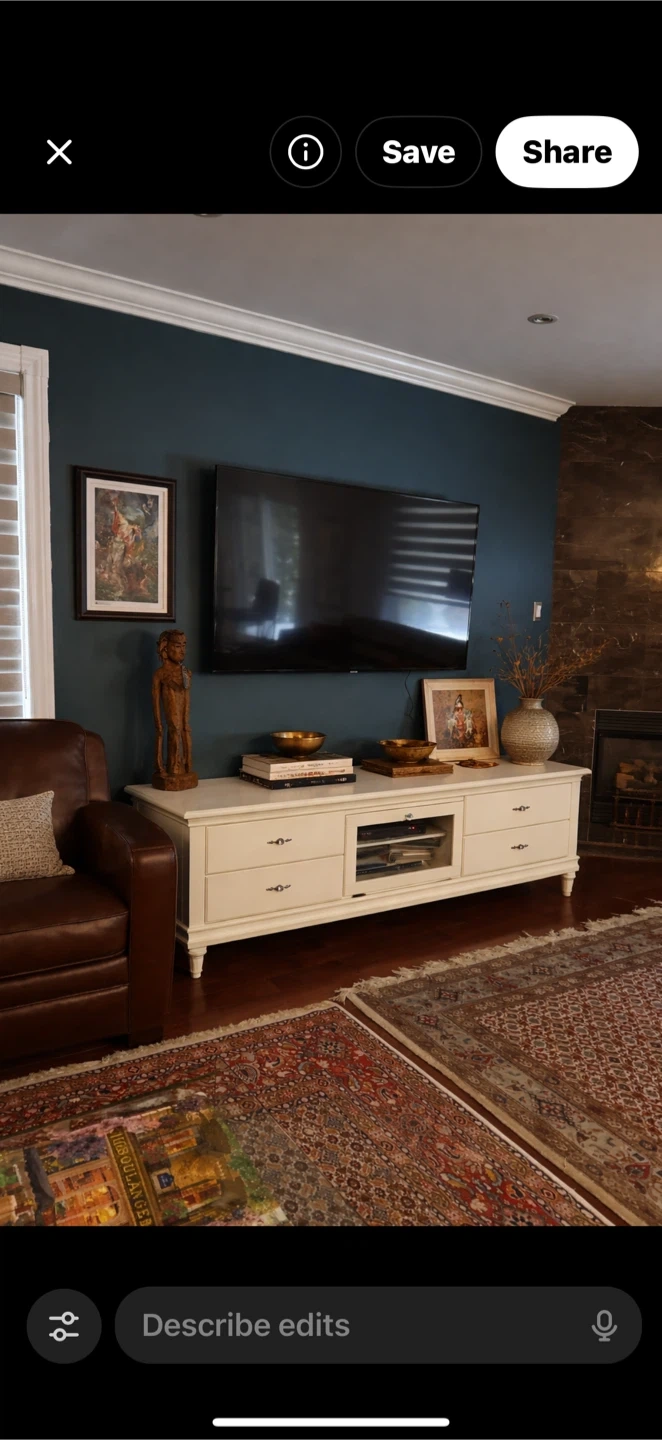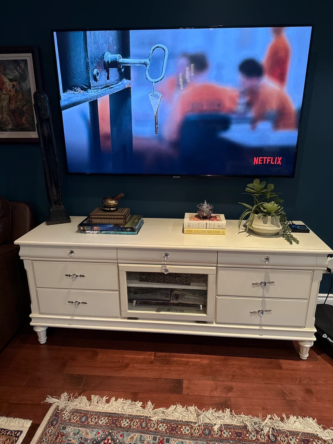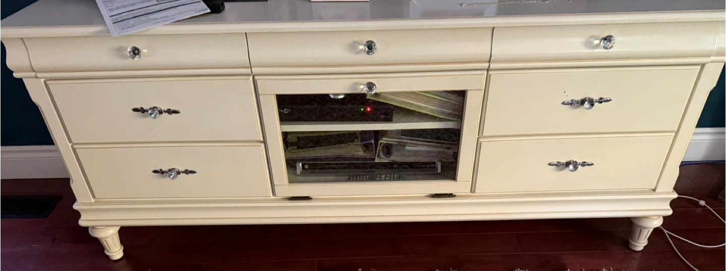 Cream coloured entertainment unit featuring a central glass-front cabinet with shelving. It has multiple drawers for storage on either side. This unit is perfect for organizing media consoles and accessories.