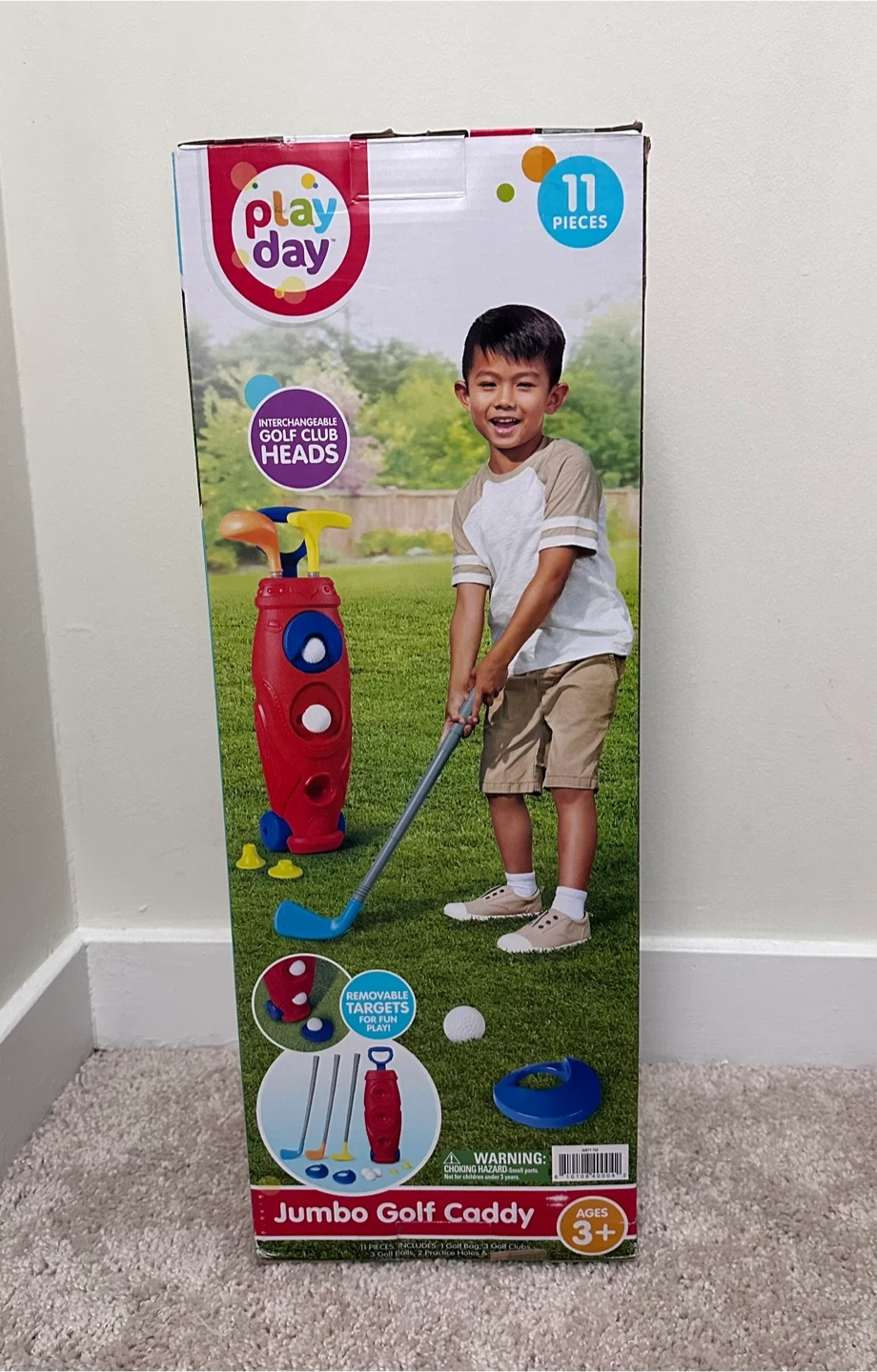This Play Day Jumbo Golf Caddy set includes 11 pieces for fun play. It features interchangeable golf club heads and removable targets.