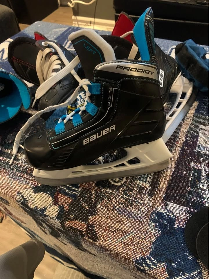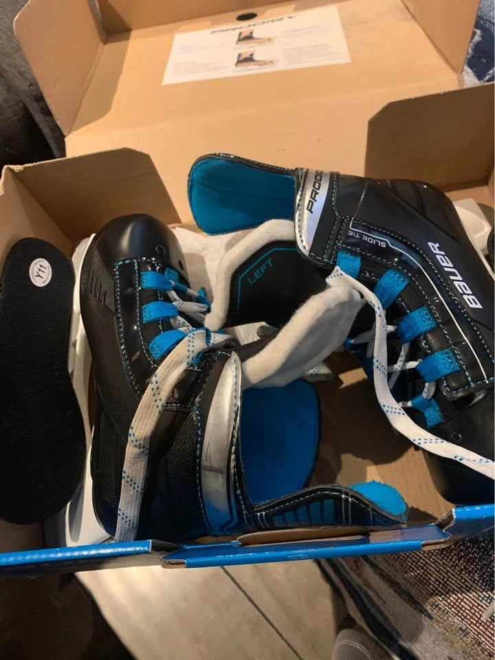 Selling 2 pairs of Bauer youth skates. One pair is size 9 youth, used for a few skating lessons. The other pair is brand new, still in the box, size 10-11 youth. Also includes a helmet, used for a couple of lessons. All items are in great condition with sharp blades. Comes with a pair of blade guards. $80 or best offer.