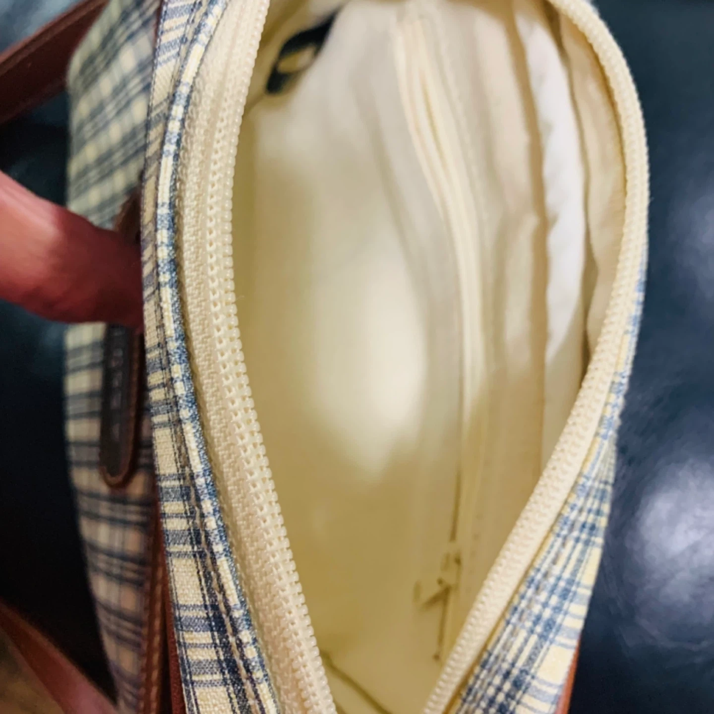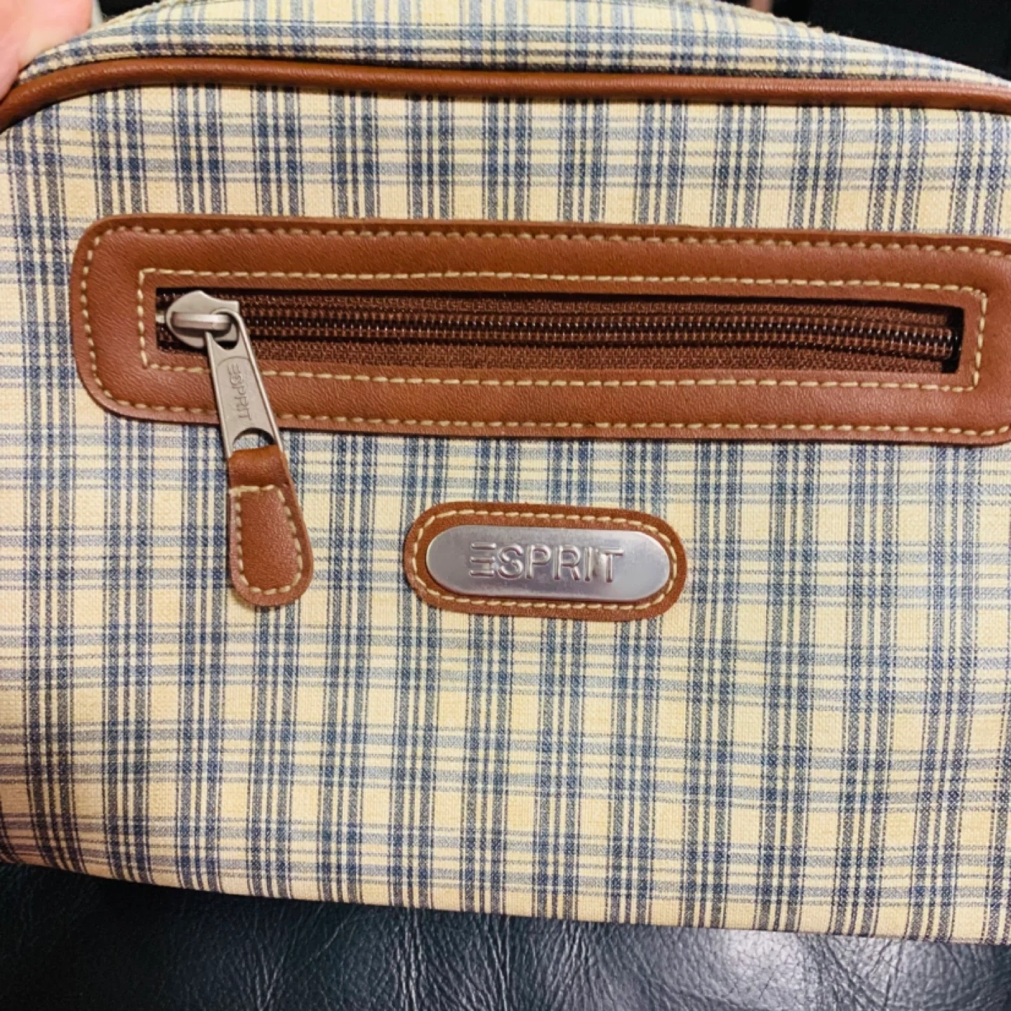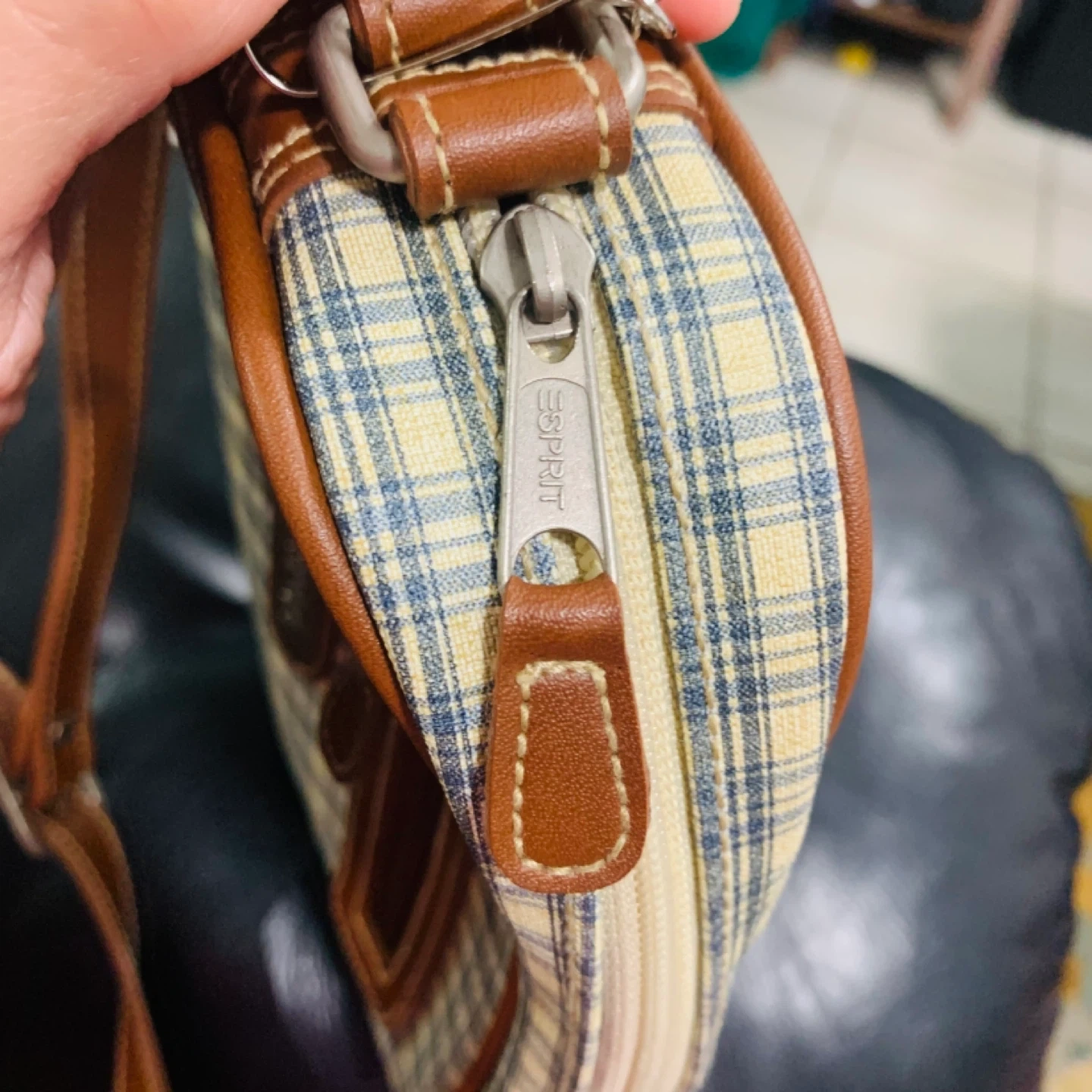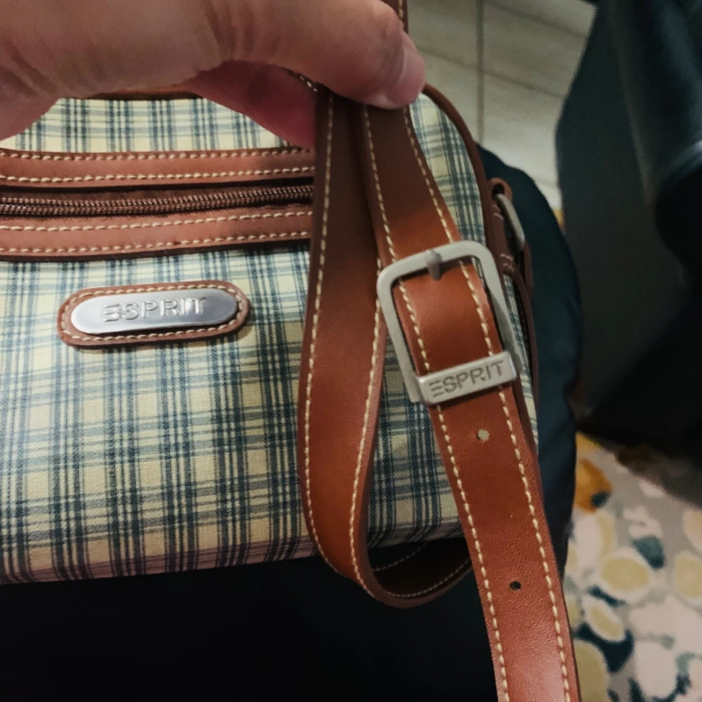 This Esprit crossbody bag features a classic plaid pattern with brown leather trim and adjustable strap. It has a zippered main compartment and a front zippered pocket. Perfect for everyday use!