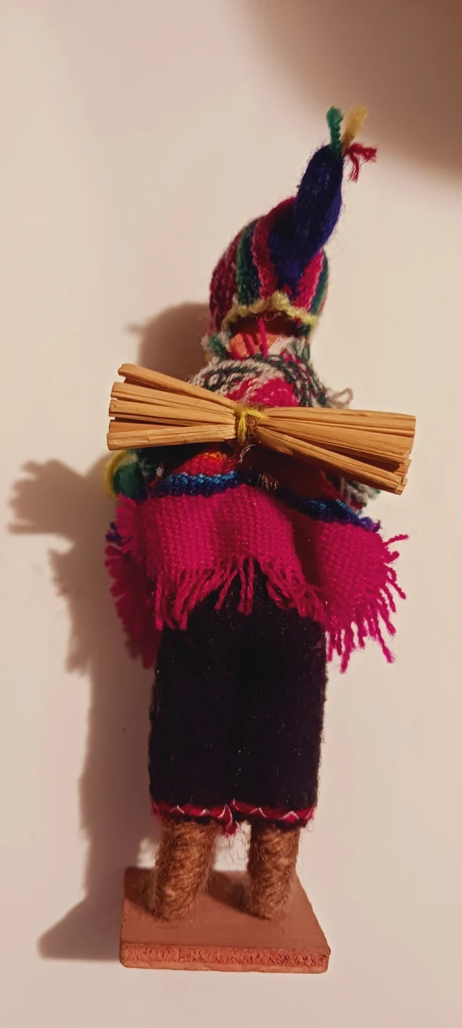 This handmade doll features traditional colorful woven clothing and a headdress. It carries a bundle of sticks and yarn, showcasing folk art craftsmanship. The doll is mounted on a wooden base. Excellent condition, like new. Made in Peru π΅πͺ 5"Γ2". ALL MY PRICES ARE NEGOTIABLE !!