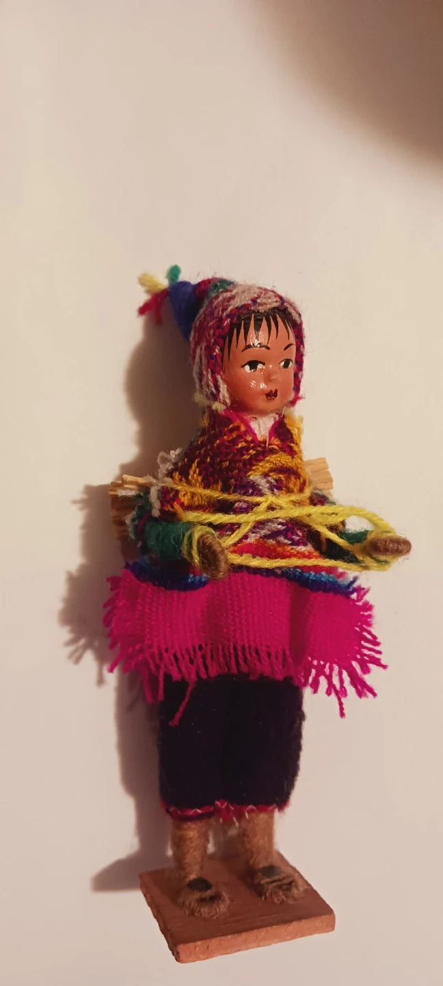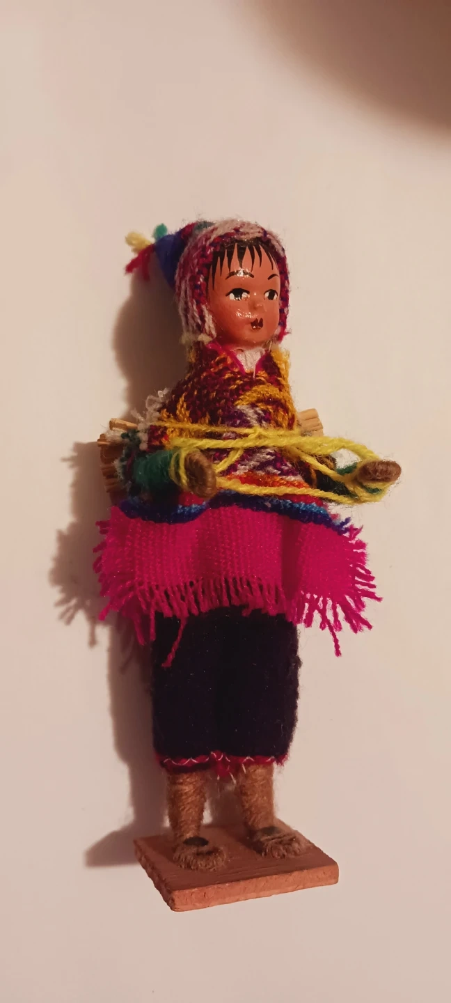 This handmade doll features traditional colorful woven clothing and a headdress. It carries a bundle of sticks and yarn, showcasing folk art craftsmanship. The doll is mounted on a wooden base. Excellent condition, like new. Made in Peru π΅πͺ 5"Γ2". ALL MY PRICES ARE NEGOTIABLE !!