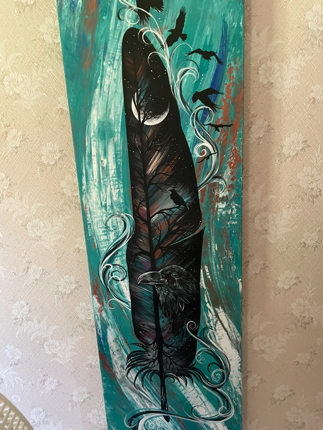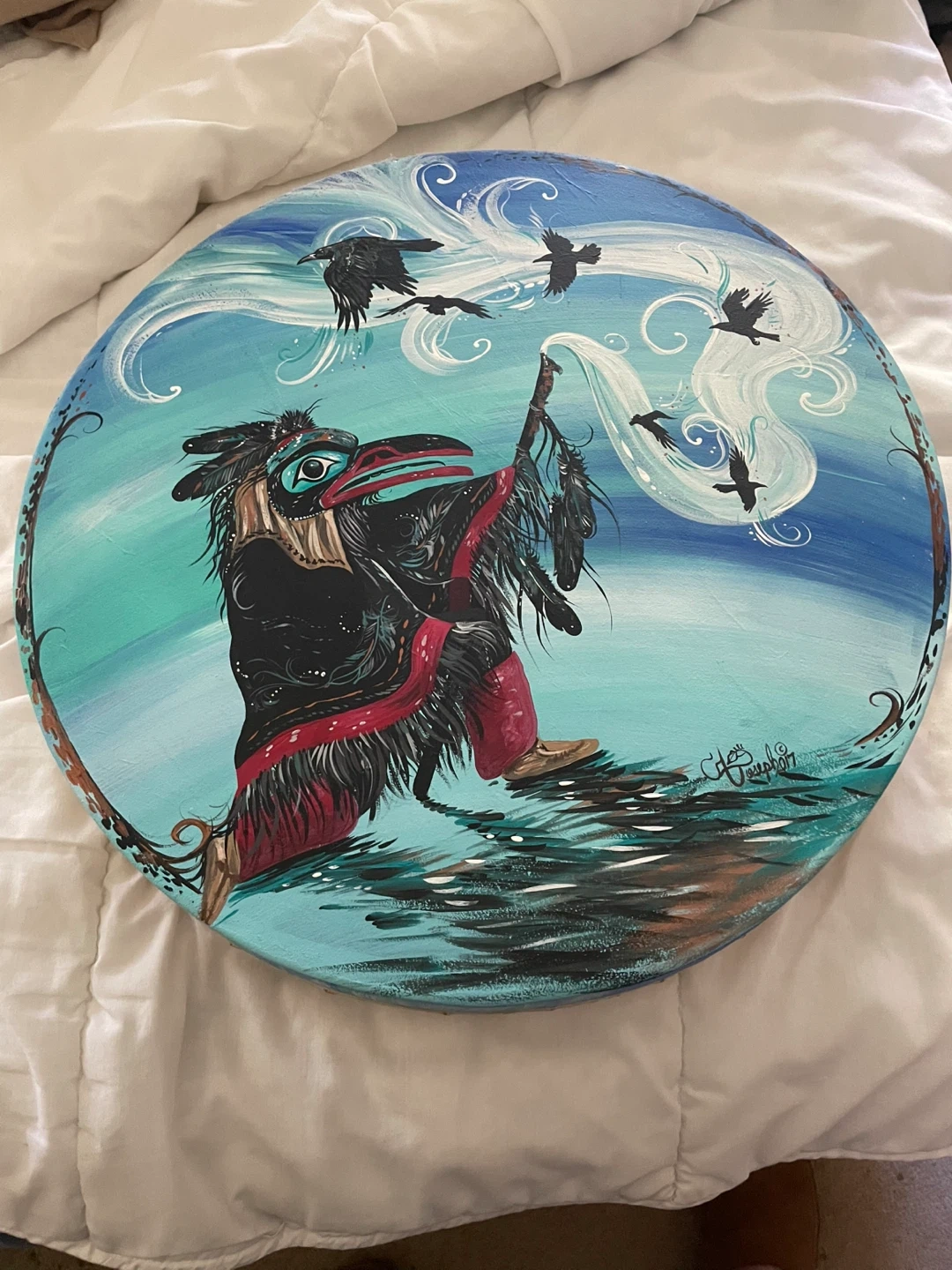 2 pieces Raven Spirit, drum and wall hanging both are original and unique no replications. The pictures don’t do this artwork justice the personal viewing is much better. These have been wonderful for me but I am moving and downsizing OBO 200$ for the Drum 100$ for the wall hanging 300 $ OBO if you take them both. The drum is 18.5 inches across and 2.5 inches deep