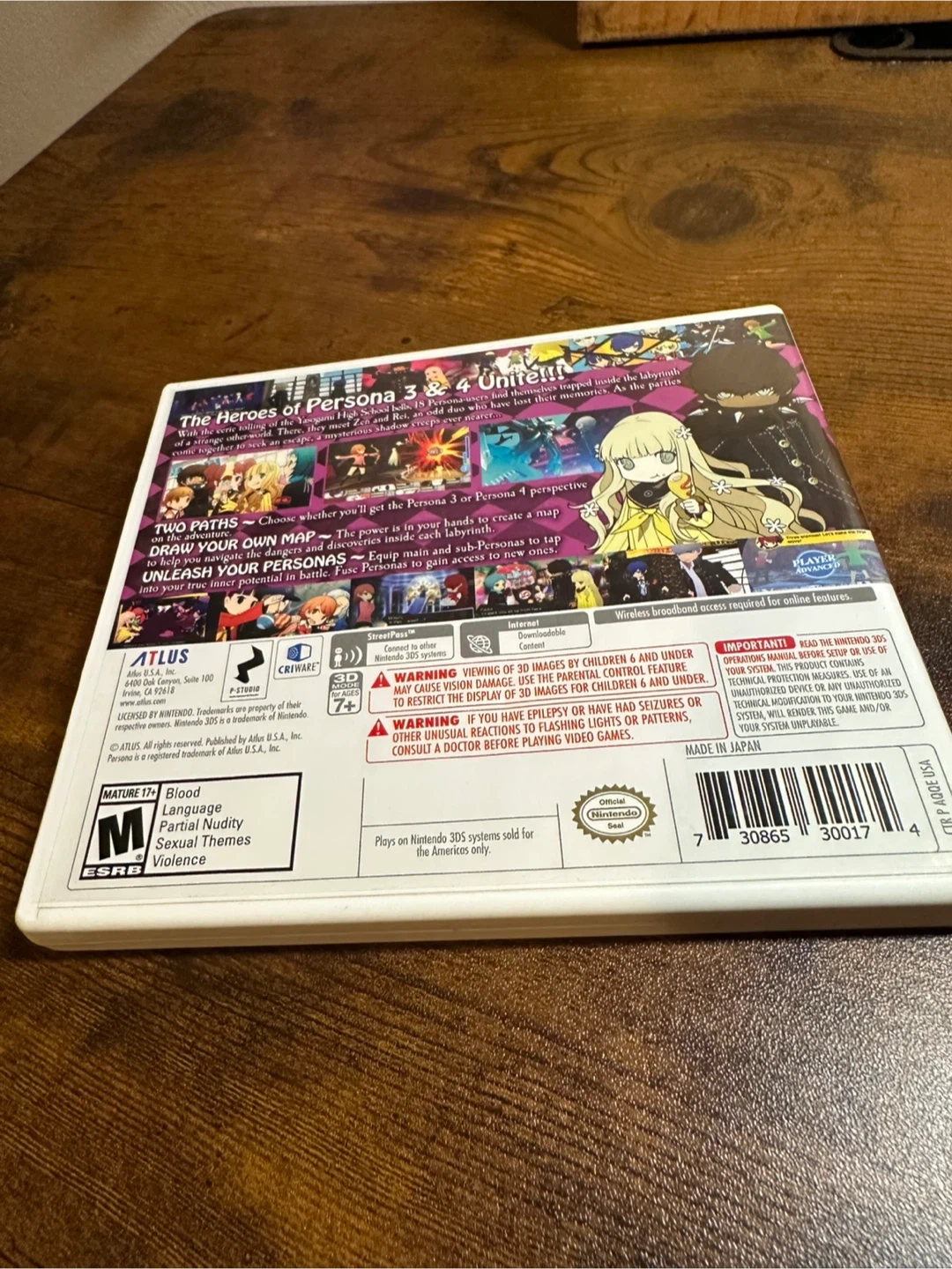This is the Persona Q: Shadow of the Labyrinth game for Nintendo 3DS. It comes complete with the original case and game cartridge.