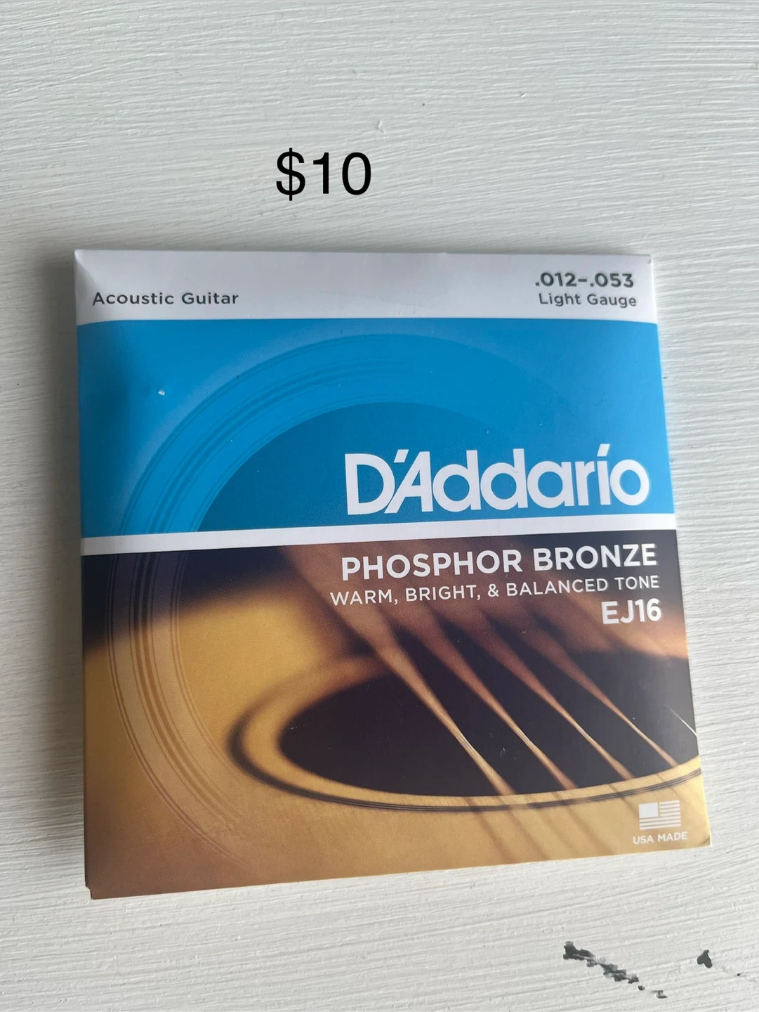 These are D'Addario EJ16 acoustic guitar strings. They're phosphor bronze with a light gauge, .012-.053. They offer a warm, bright and balanced tone.