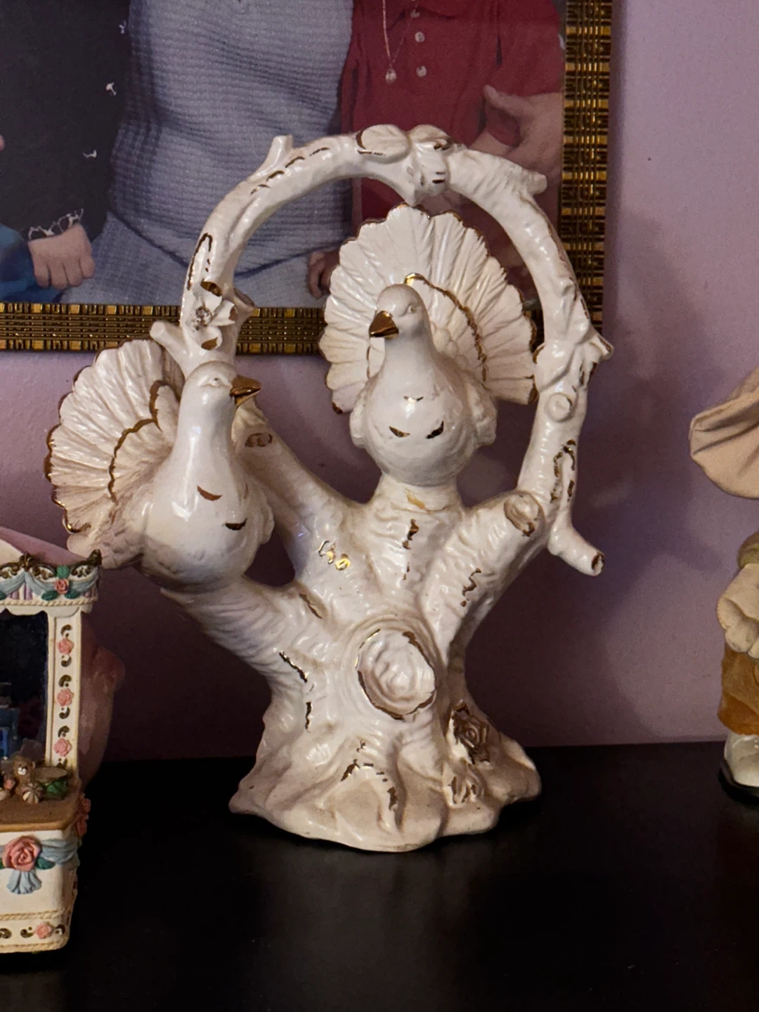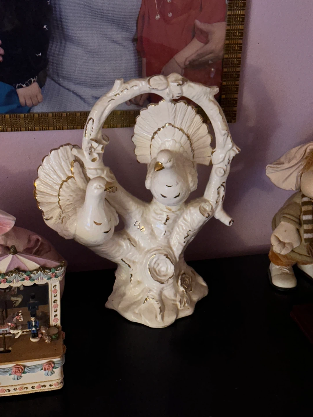 This charming ceramic figurine features two white doves nestled on a decorative tree branch. It's accented with subtle gold detailing, adding a touch of elegance. The piece has a glossy white finish with a distressed look.