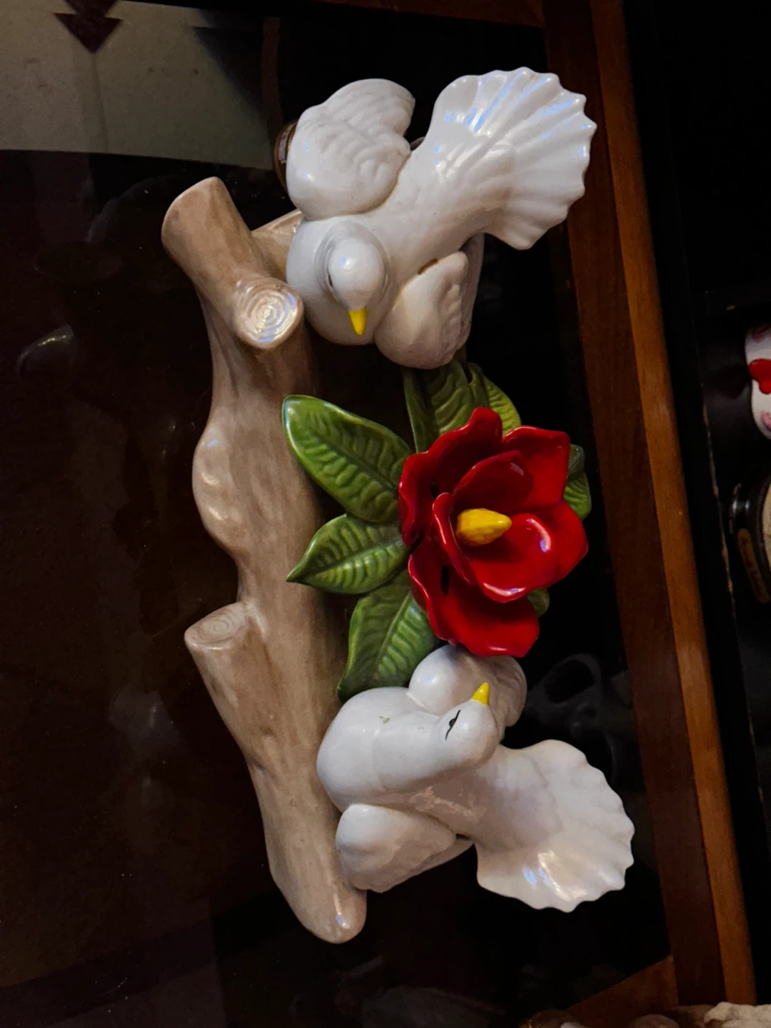 White ceramic figurine featuring two doves and a red flower on a branch. It's a decorative piece for your home. This item appears to be made of glazed ceramic.