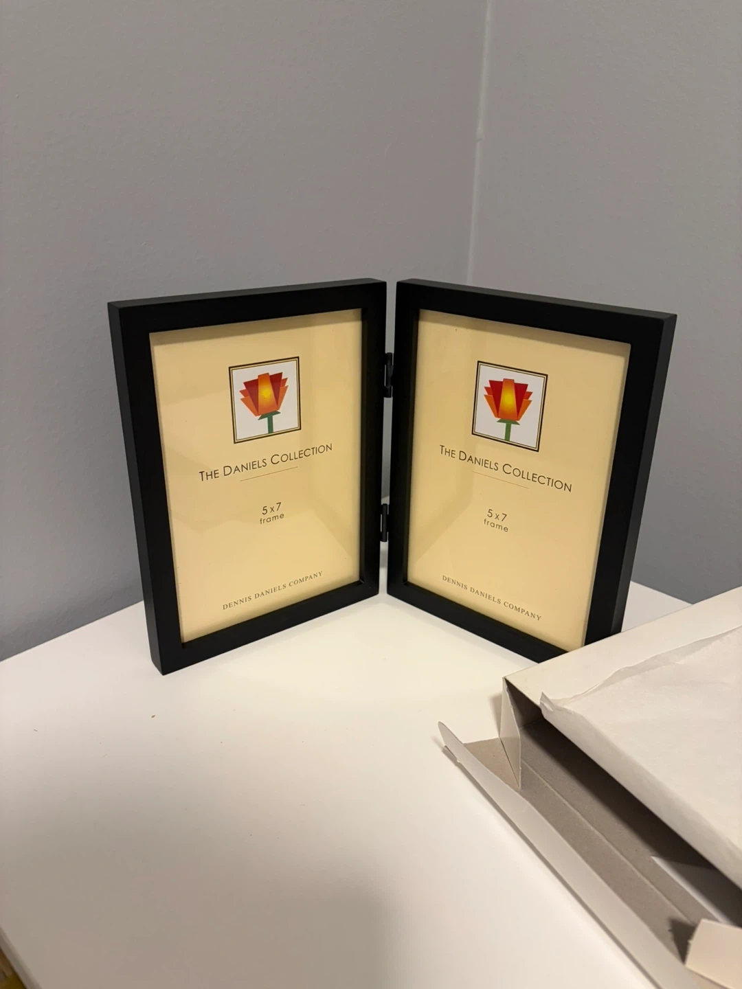 This is a black double photo frame from The Daniels Collection. It holds two 5x7 photos. Made by Dennis Daniels Company.