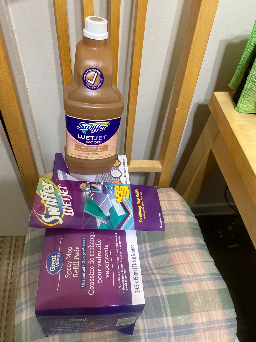 Each Set Includes 1 bottle of Swiffer WetJet Multi Surface Cleaner, 1 pack of spray, mop, refill and 1 pack of Swiffer WetJet Scrubbing Strip Refills. This cleaning solution is designed for finished wood floors. It's a spray mop refill system. (Total price compare $34)