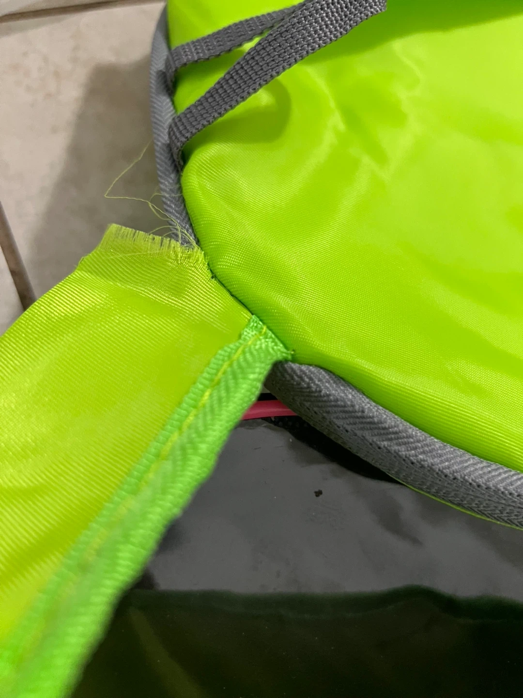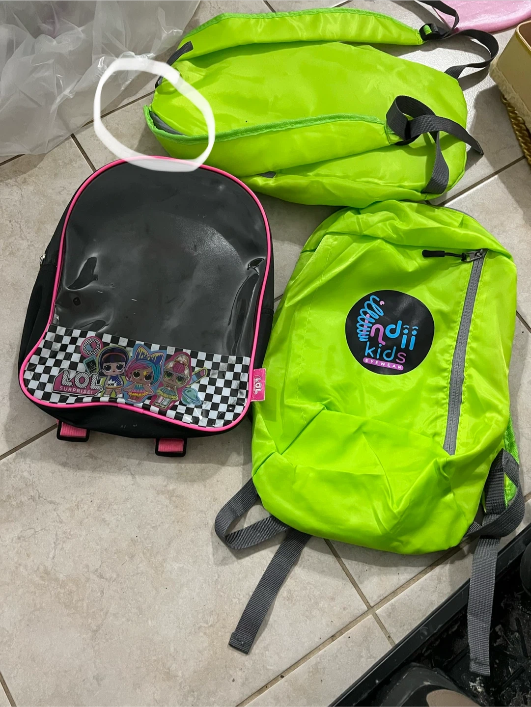 3 kids' backpacks. One green backpack has an arm strap that needs to be resewn at the top to secure it, but otherwise no holes and zippers work.