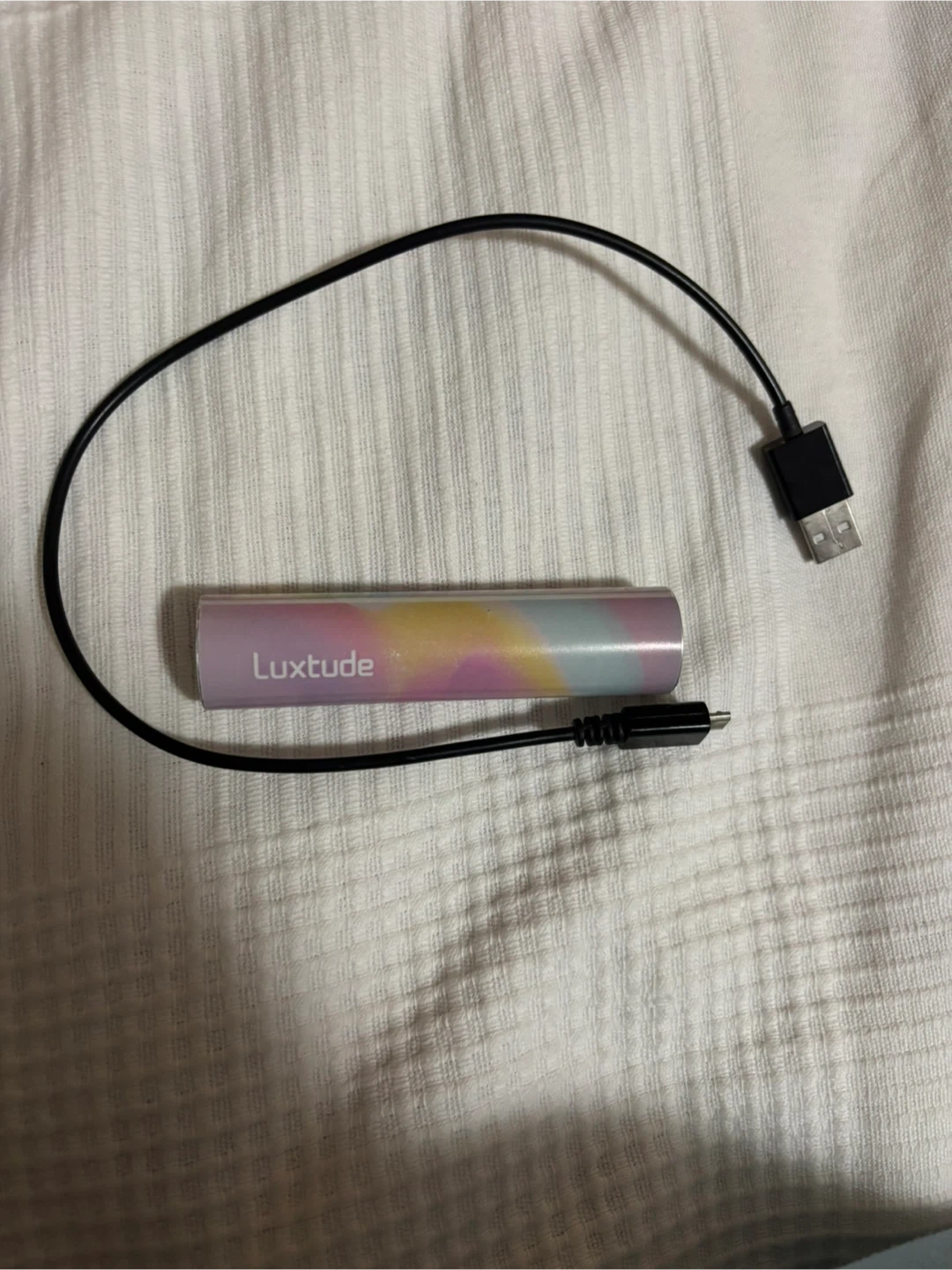 This is a Luxtude portable power bank with a 5000mAh capacity. It's designed for charging devices on the go. Includes a USB charging cable.