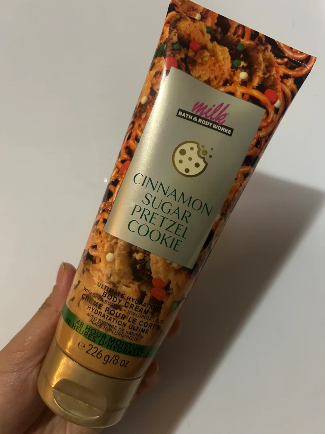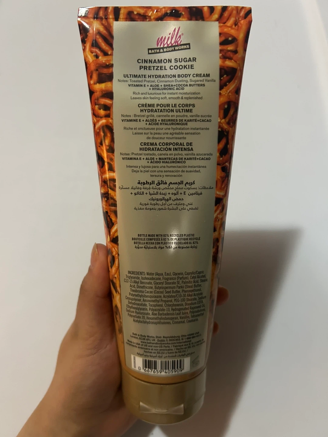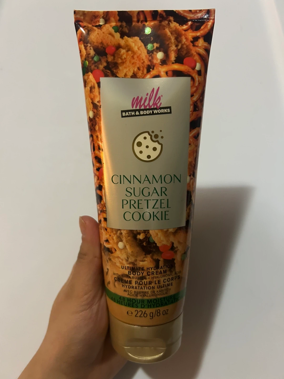This is Bath & Body Works Ultimate Hydration Body Cream in Cinnamon Sugar Pretzel Cookie scent. It's formulated with shea butter and hyaluronic acid for 48-hour moisture. The bottle is made with 82% recycled plastic.