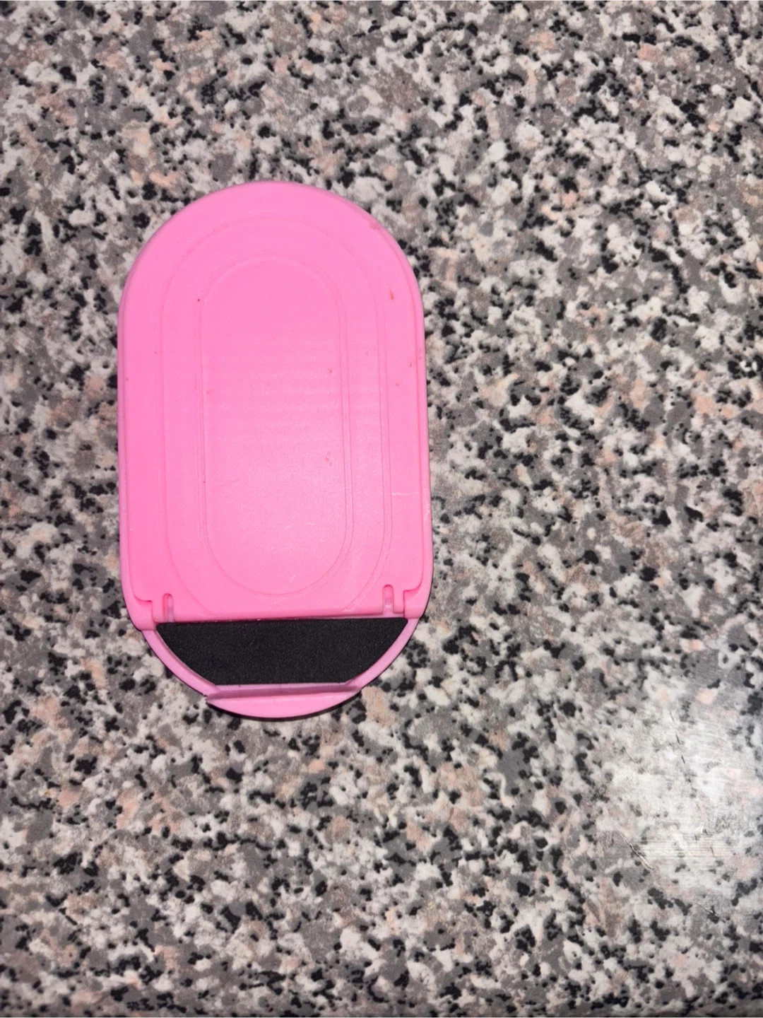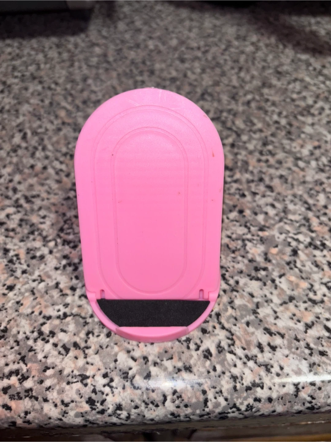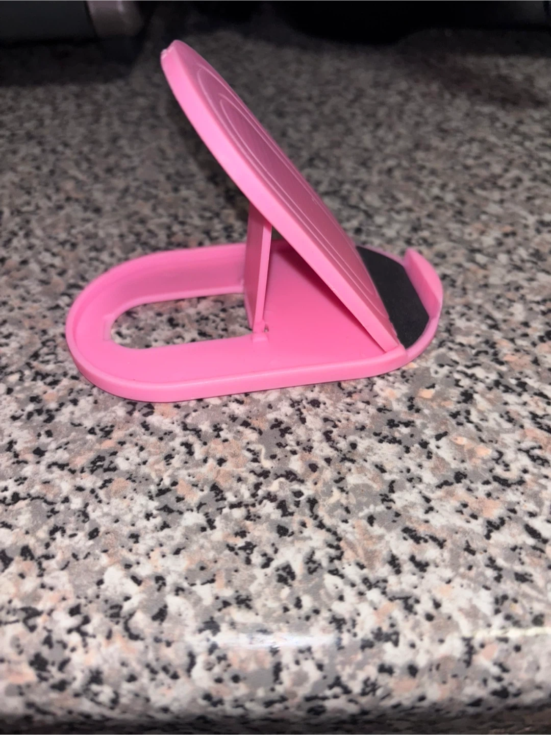 This is a pink portable phone stand. It's made of plastic and has a black foam grip to protect your device. It's foldable for easy storage and transport. Perfect for hands-free viewing!